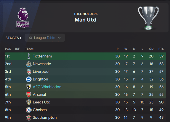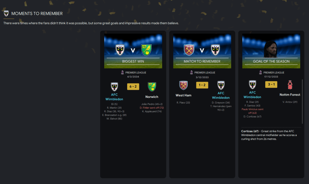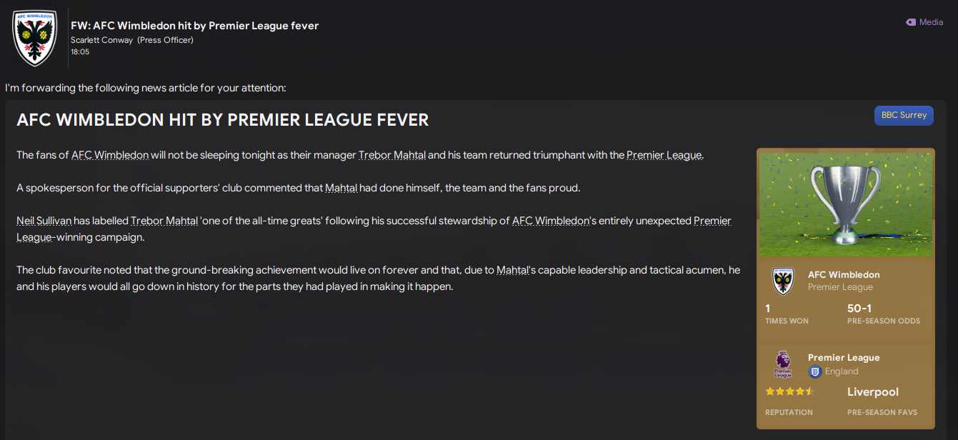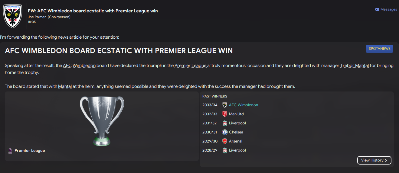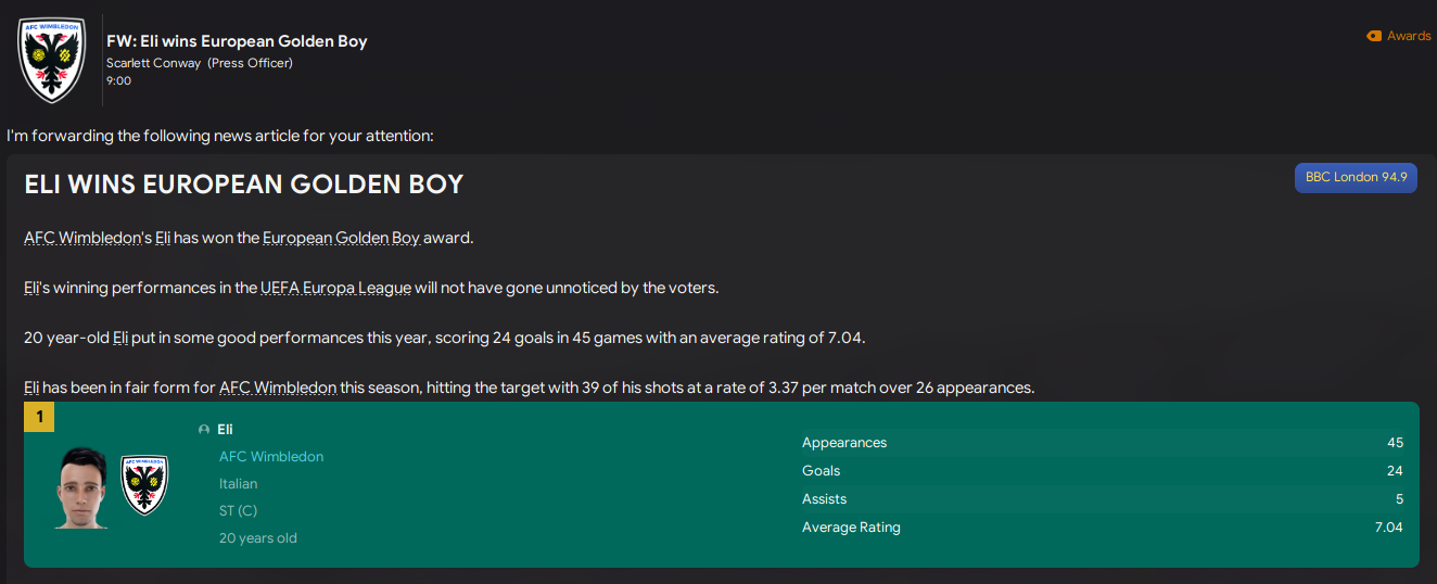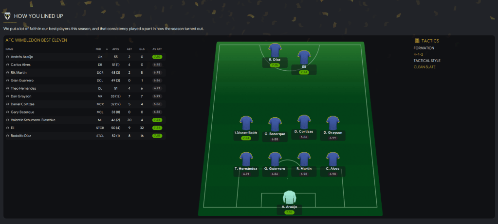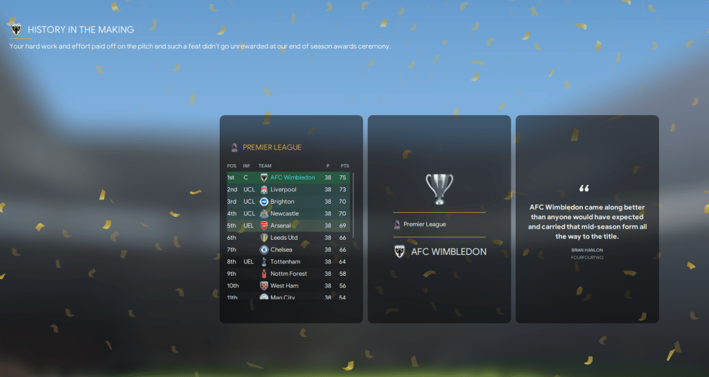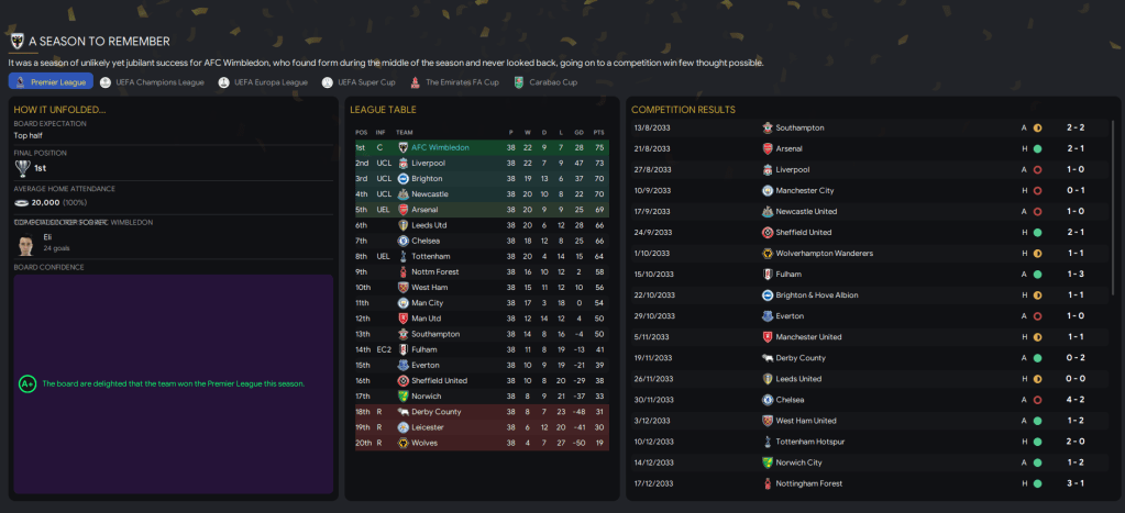 What an incredible season! We came out of nowhere to nick a first title in what has to be the poorest ever quality-wise and reached 2 semi-finals. The board rewarded me by giving me a £15k wage increase with a new £35k deal through to 2038, and the fans finally instilled me as a Legend of AFC Wimbledon.