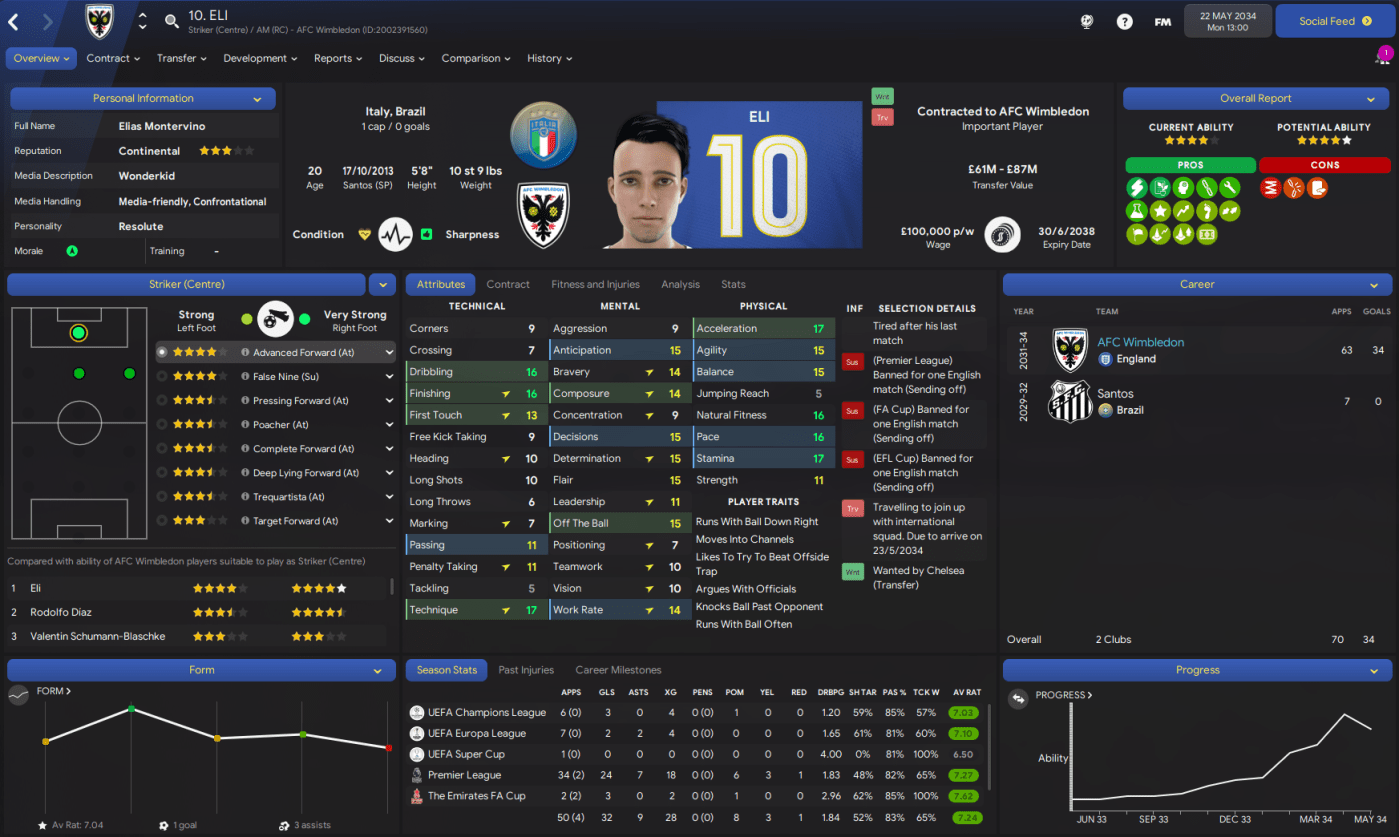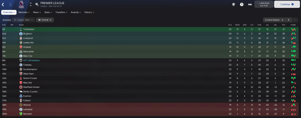 Indifferent league form left us firmly in mid-table heading into December. But Grayson came in for the underperforming Santos (6.59 from 18 games!) and scored twice in a loss at Chelsea, the opener in a 2-1 win at West Ham and the winner at Norwich. We carried that into a 2-0 win over leaders Tottenham led by an Eli brace then a strong run of form against teams down the bottom. That leaves us 8th in a very strange-looking Premier League table heading in 2034.