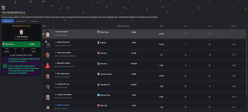The domestic player signings continued as we obliterated the club transfer record with wonderkid winger Dan Grayson for £40m rising to £68m from West Ham. And another arrived as we went in a completely different direction, bringing in a new left-back in 35-year-old Theo Hernández for £2.2m from Arsenal.