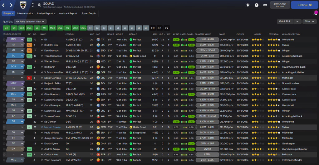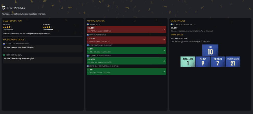 2034 began by bidding farewell to 2 more heroes of the save. Academy product and record appearances maker Alphonso Cadogan was unhappy with a lack of games and moved to Hoffenheim for £13m. He scored 43 in 322 league games and played 347 in all competitions since coming through the academy in 2023. We also sold midfielder Leonel Tus to River Plate for £5m and Santos joined Liverpool for £40m – which is a great deal considering his form has been terrible.