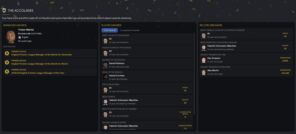 We snuck into 1st place on the final day for the 1st time all season – which I don’t think I’ve ever done on FM before – after winning our last 6 matches! And we won the league by 2 points from Liverpool on 75 points, which is a new record low winning tally. Eli finished joint-top scorer in the league with 24, which won him Players’ Young Player of the Year, and VSB got the second-most assists with 12. And I won Manager of the Year.