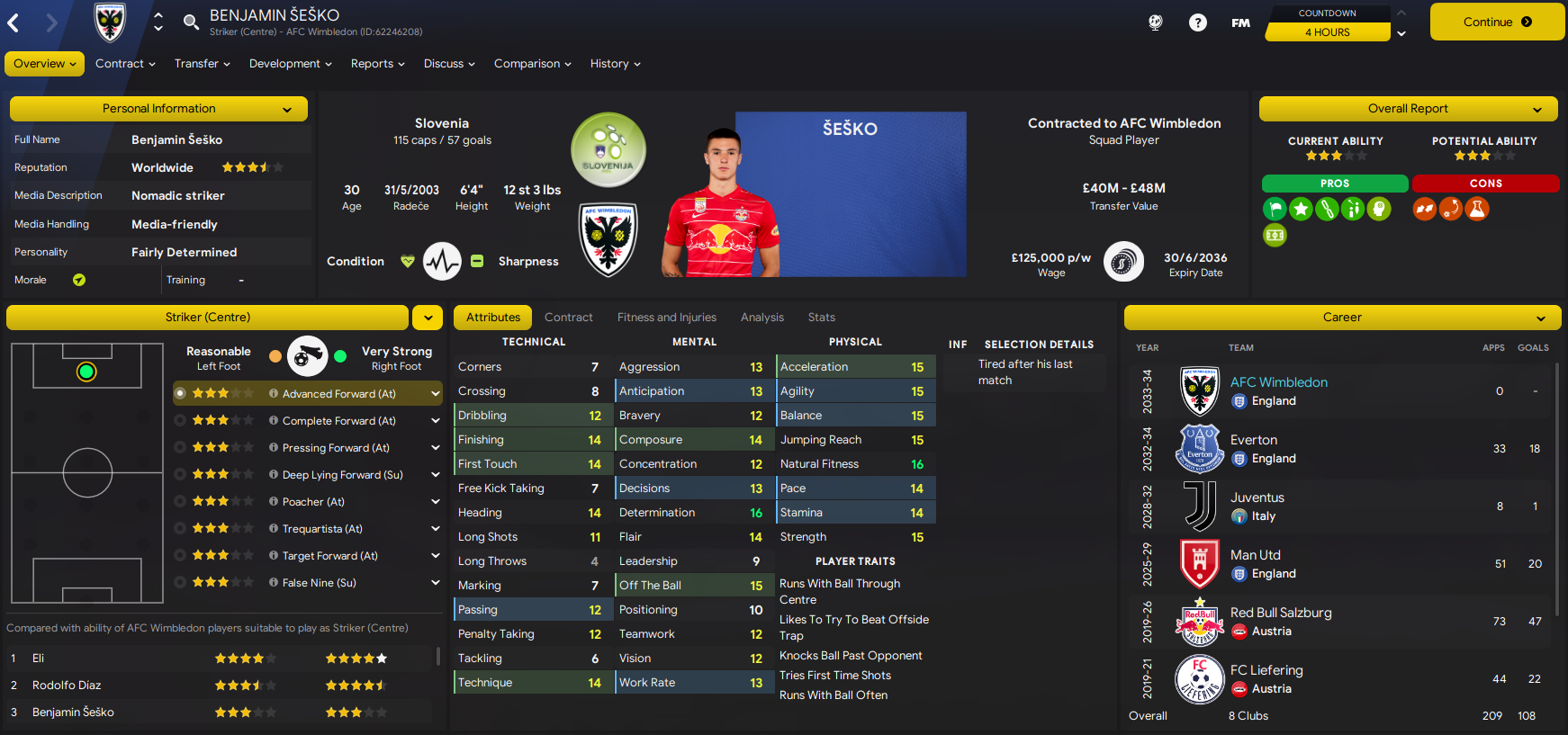 We replaced Cadogan with 19-year-old Luciano Da Luz, who cost just £400k, then brought in Real Madrid playmaker Juanjo Hernando for £34.5m on deadline day. I also decided we were lacking a big bloke up front, so we swooped for Benjamin Sesko, now 30, for £12.5m from Everton. He’s scored goals despite being criminally underused by the likes of Man UFC and Juve, so I think he’ll do a job for us.
