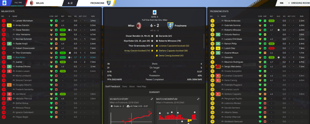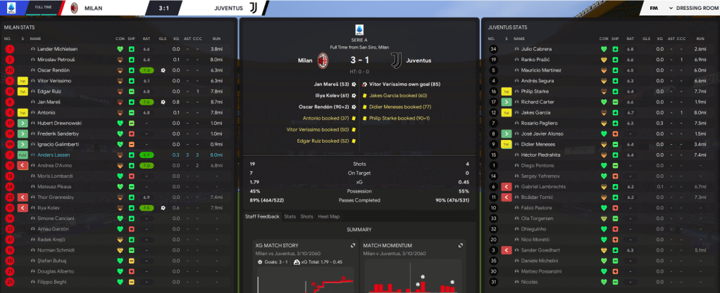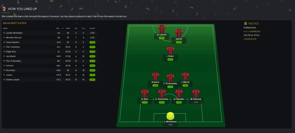 Kolev returned at Juventus, who were lingering down in seventh, and typically scored to inspire a 3-0 win that moved Milan 12 points clear at the top. That result got Manuel Locatelli sacked, Juve replaced him with Rayan Cherki, and Locatelli swiftly became England manager. Kolev got injured again as Milan lost at home for the first time in a long time, 1-0 to Roma, then drew with Lazio. But they fired back to form by thrashing Empoli 6-0 away with braces from Juarez, Mares and Lassen.
