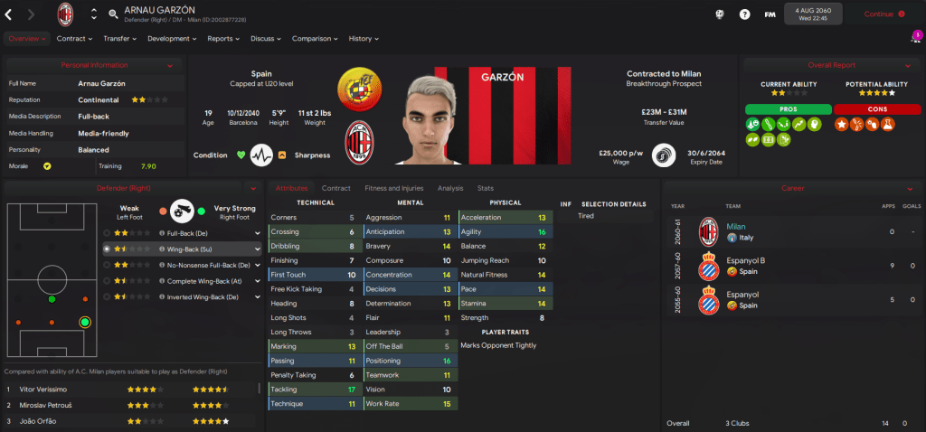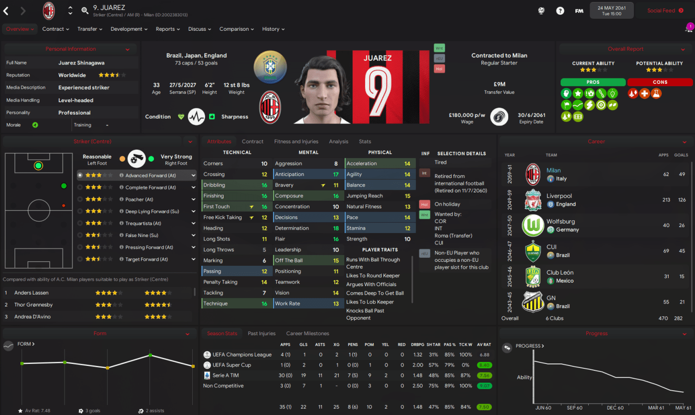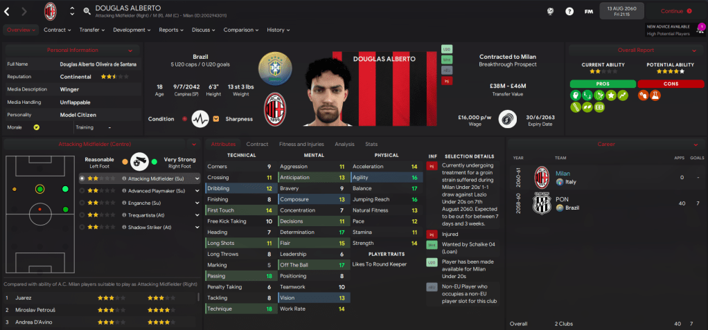 Robinho Lazaró and his AC Milan players celebrated an unprecedented double-treble in the summer of 2060 – defending their Italian Supercup, Serie A and Champions League titles. Lazaró’s personal favourite Juarez was undoubtedly the key to that success and the 76-year-old manager was thrilled to have another season working with the Brazilian in the very prime of his career.