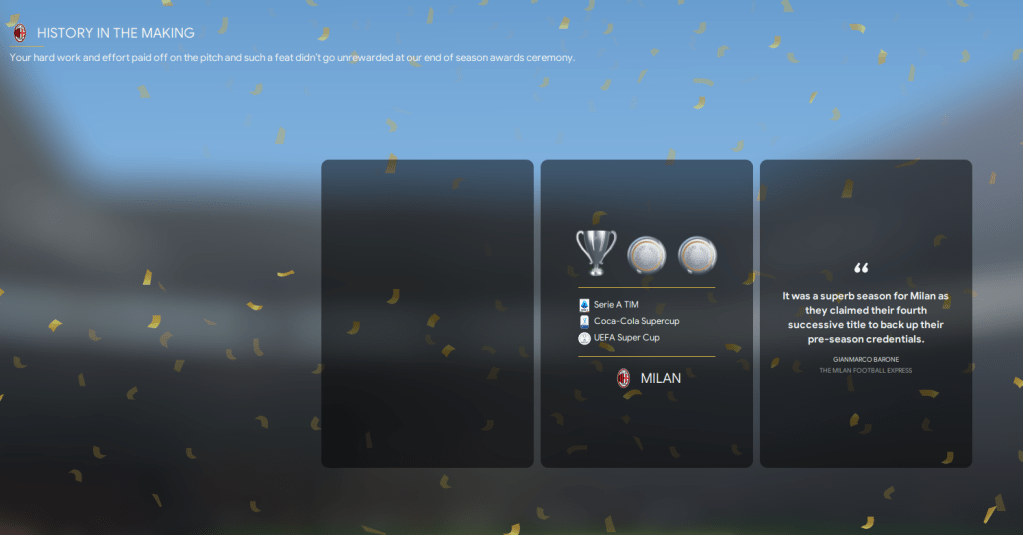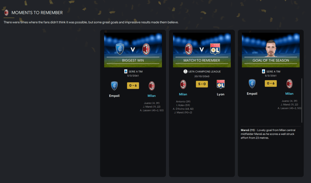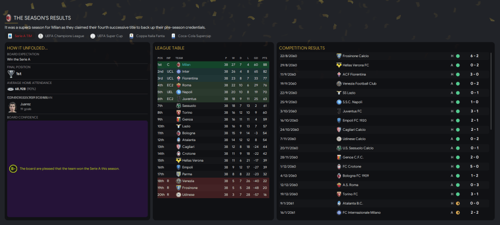 Milan began 2061 by jetting out to Michigan for the Supercup. They won it for the third year in a row as Krejci and Vítor Veríssimo strikes downed Roma 2-0 – which saw Lazaró claim his 25th cup trophy.