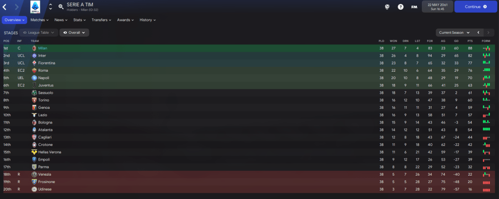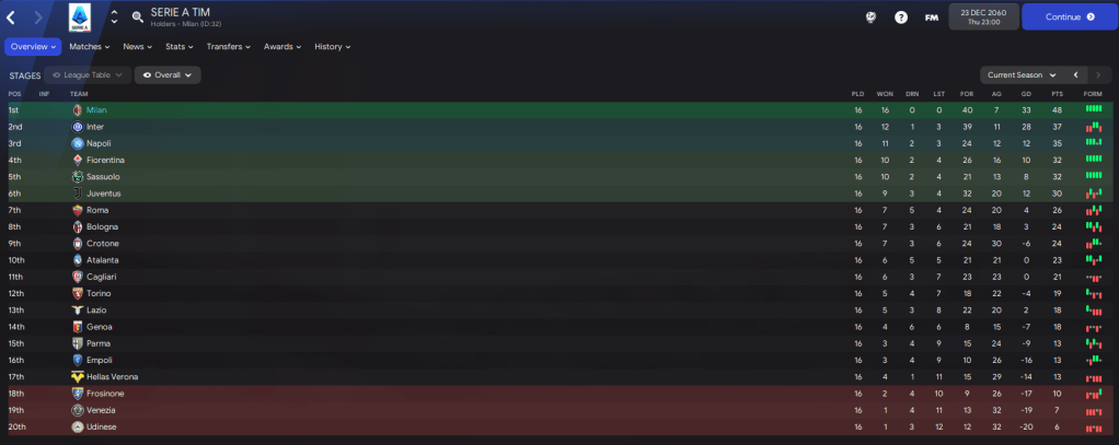 Their incredible winning league start ended in the first game of 2061 as they drew 0-0 with Atalanta then 2-2 at Inter, who undeservedly equalised with their first shot and again in the last minute. They returned to winning ways with victories at Parma and Frosinone before losing their unbeaten start at Fiorentina, who nicked a 1-0 late on. But they were back to their best to defeat lowly Verona and Venezia, with a rare Lassen double inspiring a 4-2 win in the latter.