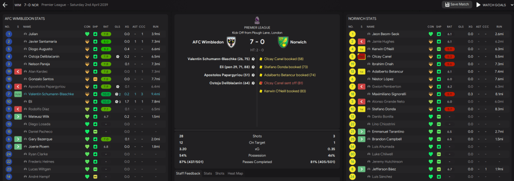 Our bid for 4 successive titles was looking pretty good but the run-in began with a trip to Man City. Our strong record against them continued as VSB scored the only goal and he added 2 more alongside an Eli goal as we thumped Marcus Rashford’s Sheff United 4-0 to move 14 points clear. That fired Eli back into lethal form and he bagged a hat-trick as we smashed Norwich 7-0.