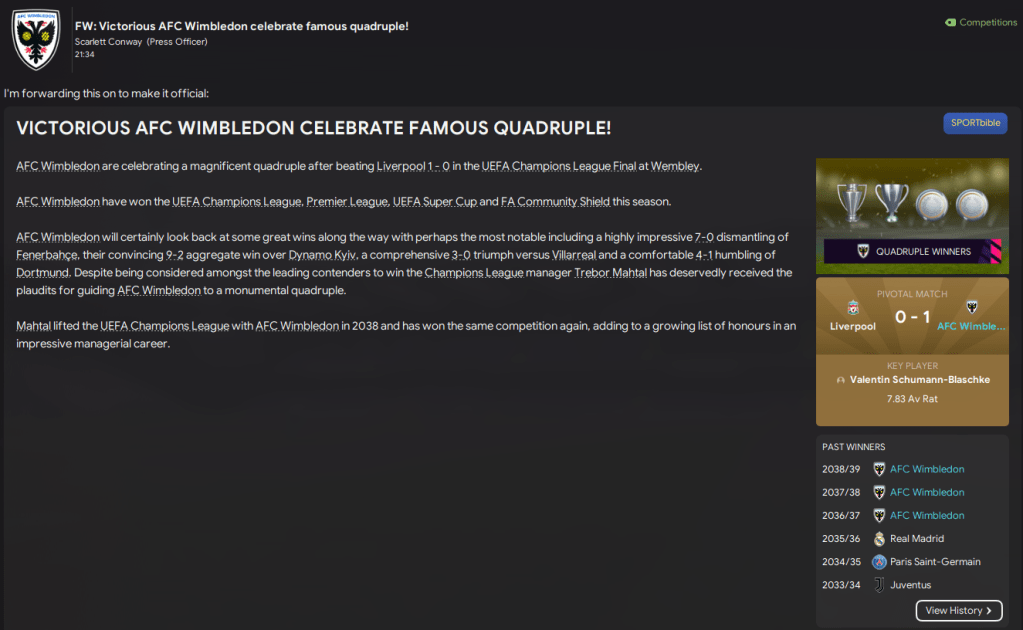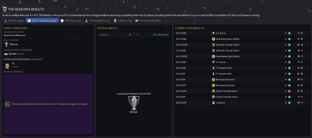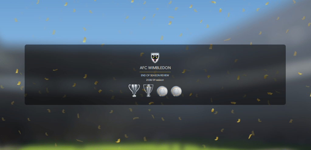 This has been my best season in charge of AFC Wimbledon, crowning some pretty amazing seasons before it. We dominated the league and waltzed to Euro glory, winning another Charity Shield, Super Cup, Premier League and Champions League quadruple – after selling £300m worth of talent in the summer. And this success lifted me into the Worldwide Hall of Fame for the first time.