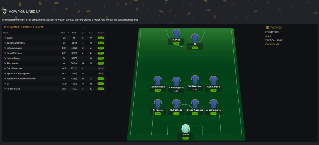 Eli finished with an incredible 42 league goals, 9 player of the match awards and a 7.77 average rating from 35 games – scoring a goal every 70.48 minutes. Unsurprisingly, he won the Footballer of the Year and Players’ Player of the Year. Pushing him close was VSB, who was back to his best with a league-high 16 assists, which is 1 off Elliott’s record last season, and 6 player of the match awards. Julian won the Golden Glove with 22 clean sheets, conceding just 17 in 36, and Kardec got the third-most assists with 12 and won Players’ Young Player of the Year.