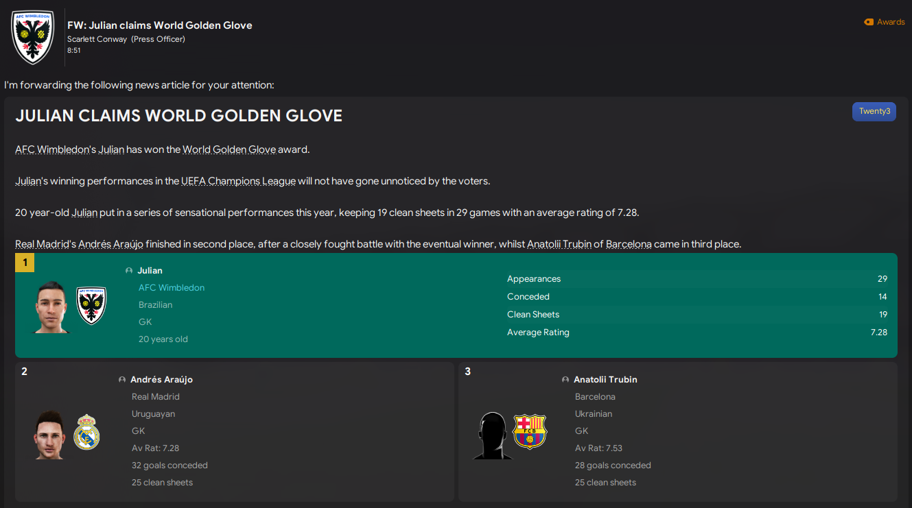 VSB pushed him close though, setting new club records with 29 assists and 13 player of the match awards and the highest average rating at the club of 7.84 from 45 games. He also set new Champions League records of 12 assists, 6 player of the match awards and an outrageous 8.56 average rating (which smashed Mbappé’s 8.28 in 2035) from 9 appearances. And Julian set a new club record 26 clean sheets in just 46 appearances in all competitions.
