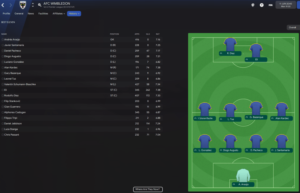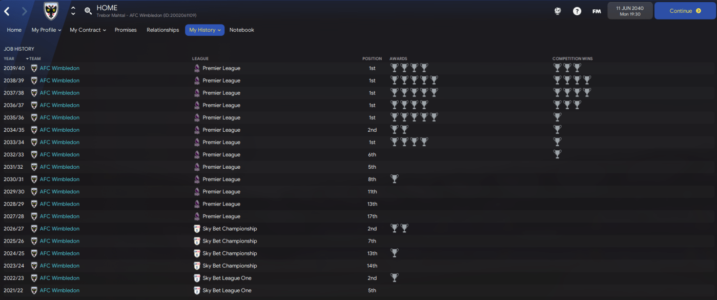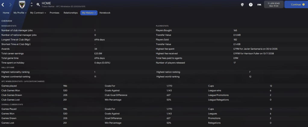 I finished the save as a one-club man who led AFC Wimbledon in 986 matches, winning 530, drawing 205 and losing 251 with a win percentage of 53%. We scored 1,770 goals and conceded 1,143 during my tenure. I topped the English ranking, finished 11th in Europe and 12th in the world and earned £23.5m throughout my career. We sold 182 players for £1.43 billion and signed 165 for a total of £1.04 billion, with a highest fee of £79m for right-back Javier Santamaría from Athletic Bilbao in 2035 and biggest sale of £191m when Harrison Fuller joined Real Madrid in 2038.