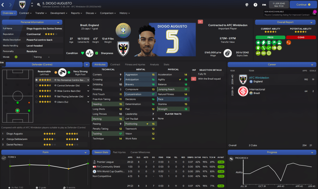 CB – Diogo Augusto: The Brazilian is our answer to Virgil Van Dijk, he is absolutely dominant in the heart of the Crazy Gang defence. He struggled a little at first but developed into the best centre-back in the world over the last 2 seasons.