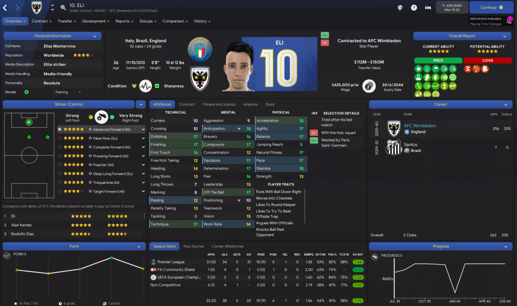 CF – Rodolfo Díaz: Uruguayan Díaz has a slightly less impressive goalscoring record of 172 in 407 games, but his contribution cannot be underestimated. He joined for just £1.4m in 2030, was our vice-captain for several years and led by example, not dropping below a 7.28 average rating after 2033. And his goalscoring efforts aren’t bad considering he had 7 finishing when he arrived at the club.