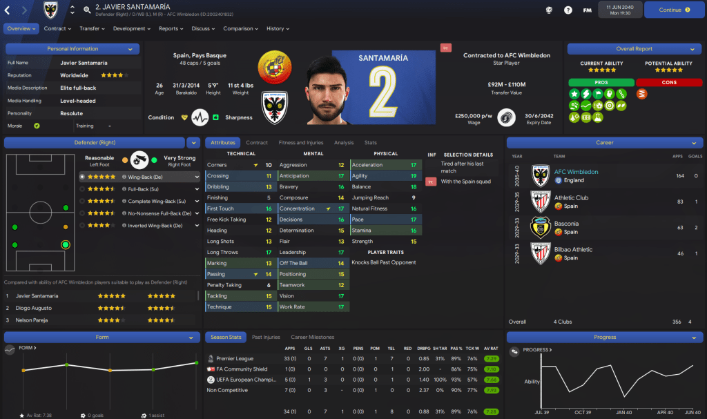 RB – Javier Santamaría: Our all-time record signing played 228 games in all competitions but never scored despite a 7.25 average rating. Now 26, he’s probably the best right-back in the world.