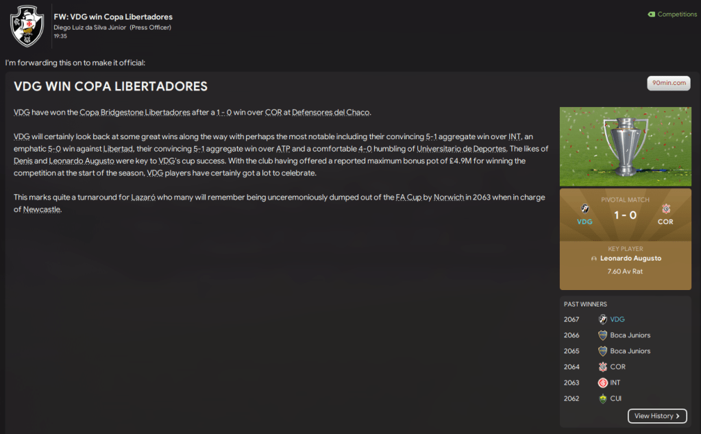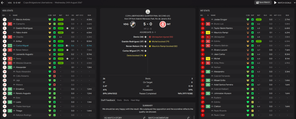 Another all-Brazilian affair was waiting in the semis as Vasco took on Paranaense. They did well to earn a 1-1 draw away but home advantage was crucial again as a Messias Eduardo brace following goals from Denis and Carlos Miguel led a 4-0 hammering. Although Paranaense wasted 17 attempts. Vasco were headed to the Copa Libertadores Final for the first time since winning it in 2060!