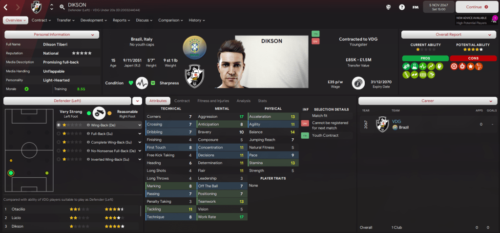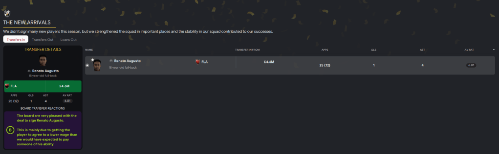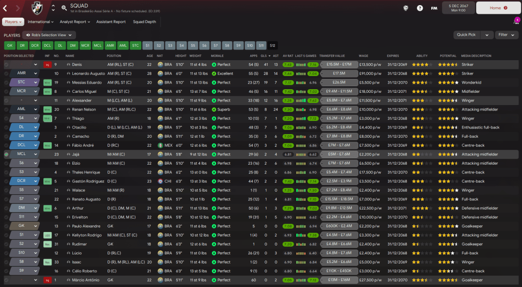 Vasco began the season with 32 players of 5-star potential, a further 13 with up to 4.5-star potential and seven with 3.5- or 4-star potential. They also had £55 million of transfer budget to work with but Lazaró was keen to keep improving the young squad he ‘d already built. But he did add even more potential with 17-year-old right-back Renato Augusto, who cost £4.6 million from Flamengo.