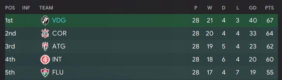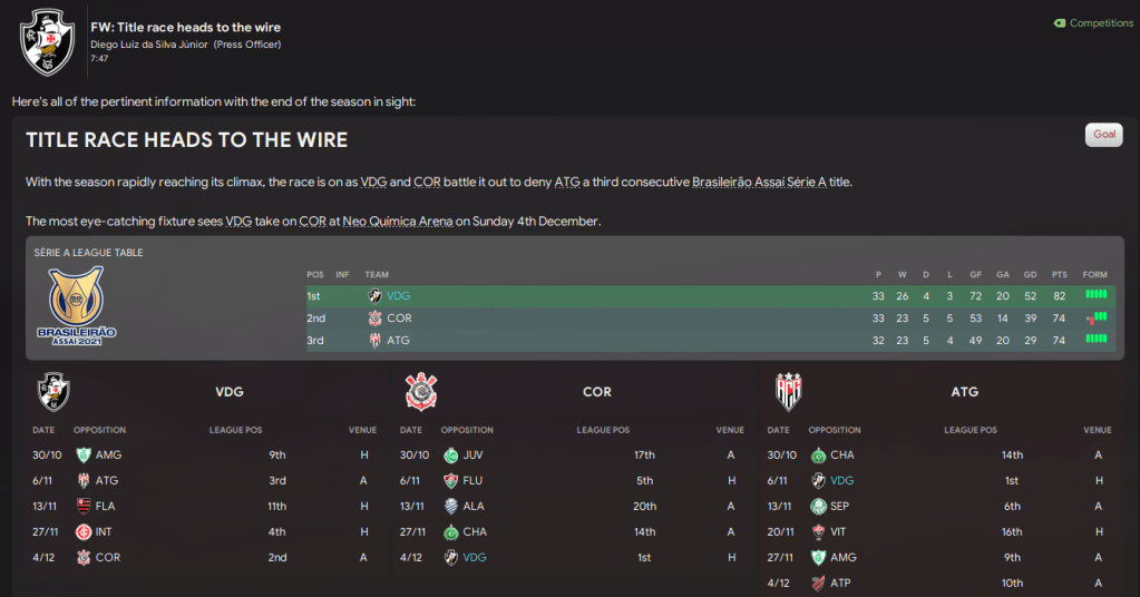 Game 4 – Internacional (4th, home): Vasco were hit with major injury concerns as both Denis and goalkeeper Márcio António were ruled out for the rest of the season with training injuries. But some time off did the rest of the squad the world of good as they absolutely dominated Internacional by 21 shots to one and won 3-0 thanks with Alexsander scoring two and creating the other for Messias Eduardo and Paulo Alexandre keeping a clean sheet on Série A debut. Corinthians drew 3-3 at Chapecoense to drop out of the race but Goianiense nicked a 1-0 win at América in the 81st minute to take it to the final day.