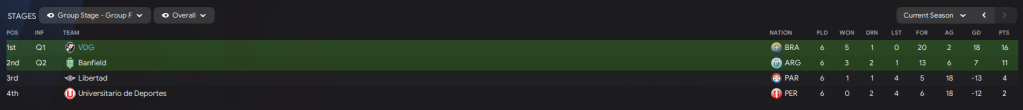 They began at home to Universitario and hammered them 4-0 with goals by Carlos Miguel wingers Leonardo Augusto and Renan Nelson, who also got three assists, and holding midfielder Arthur. They then won 3-0 at Banfield and took total control of the group as an early Carlos Miguel brace and a Leonardo Augusto assist hat-trick inspired a 4-0 win over Libertad then exciting academy product winger Thiago bagged a brace in a 5-0 win in Paraguay. A 1-1 draw at home to Banfield, with midfielder Jajá becoming the youngest-ever Vasco goalscorer aged 16 years 304 days, won the group before a rotated side won 3-1 in Peru.