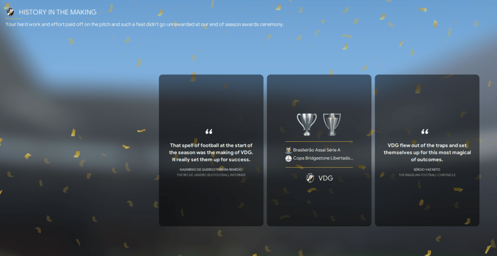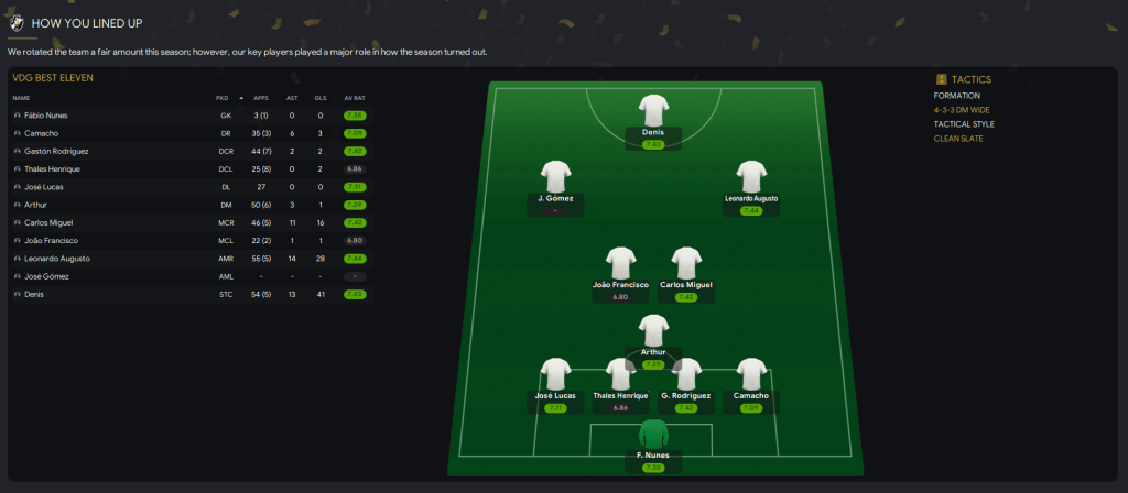This year’s star man was Denis, who scored a new Vasco record 34 league goals and 41 in 59 appearances in all competitions. Pushing him close was Leonardo Augusto, who scored 28 and got 14 assists with a club-high 7.44 average rating in 60 appearances. Messias Eduardo scored 19 in 50, followed by Carlos Miguel (16), Alexsander (12), Renan Nelson (8) and 18-year-old Thiago (7). Midfielder Renan Nelson set a new Vasco record of 24 assists followed by Alexsander (16), Leonardo Augusto (14), Denis (13) and Carlos Miguel (11).