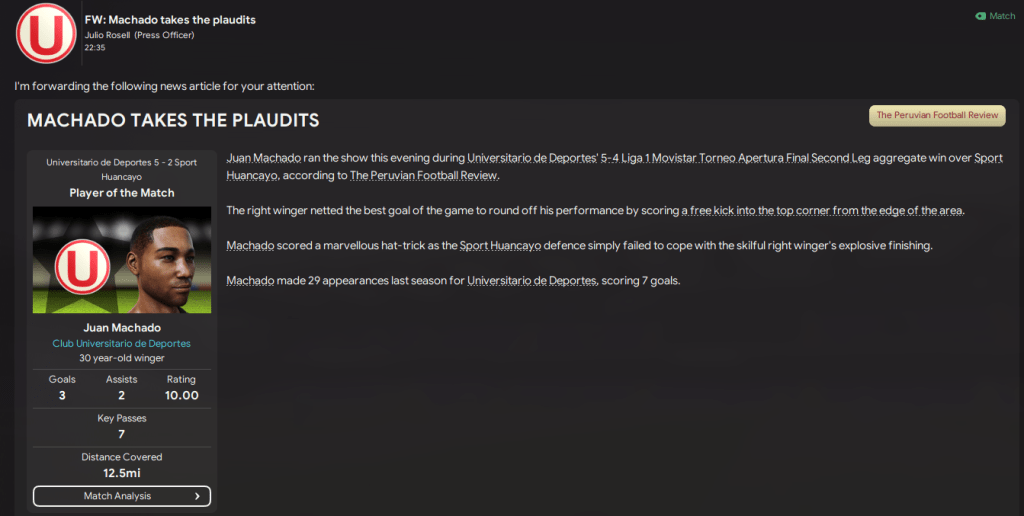 The club is, of course, a fierce rival of Alianza Lima, with whom Lazaró lifted the Peruvian title and Copa Sudamericana way back in 2031 – which was so long ago that the Universitario board seemingly didn’t remember it happened. Universitario haven’t been national champion in 14 years going back to 2054 but was runner-up in 2065 and 2066. It also hasn’t won the Peruvian Cup in 29 years since 2039.