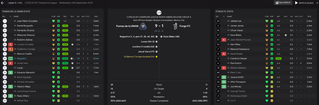 Pumas’ Champions League Group saw them paired with Real Salt Lake, Seattle Sounders, Forge FC and Lazaró’s former side Puebla FC. Lazaró threw Mejía in for his debut in the opener at home to Salt Lake and he played well and got an assist as a Nogueira brace led a 4-0 win. They lost 2-0 at Puebla then Nogueira took things to a whole new level as he scored an incredible double hat-trick and an assist in a 9-1 battering of Forge! Mejía scored his first senior goal in a 2-0 win at Seattle to help his side advance.