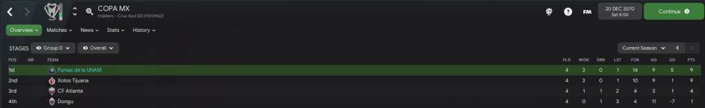 Pumas unsurprisingly lost their first Copa MX game as Lazaró threw in the reserves, who managed to win their next two games then won a 6-4 thriller at home to Xolos Tijuana led by a Manzotti hat-trick, which ensured they qualified for the quarter-finals.