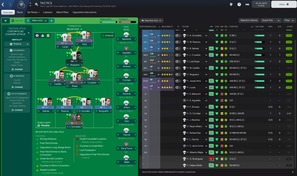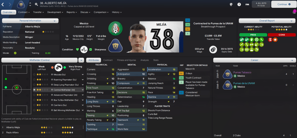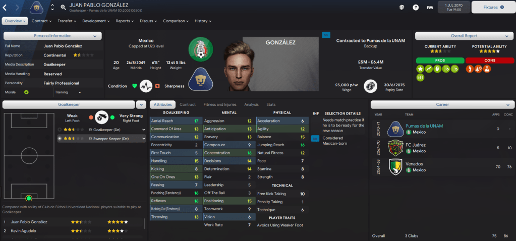 Pumas’ squad now contained 10 players with 5-star potential and 17 of the 23-man first-team squad had at least 4.5-star potential. Only three of the squad are aged over 21 and only Wbeymar Riascos (33) is over the age of 29, with the club’s average age now down to just 21.0. And Lazaró felt no need to move away from the 4-3-1-2 that worked nicely last season: