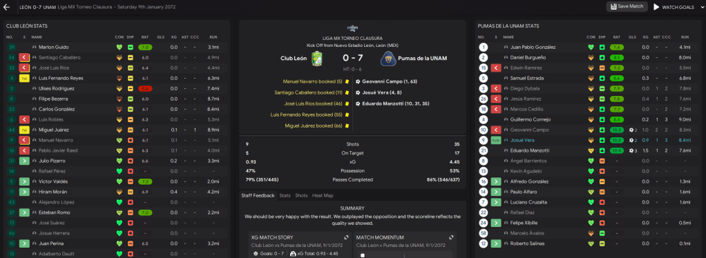 The major tournament evading Lazaró upon his return to Mexico was Liga MX Clausura. But the players had a nice long rest over Christmas and it seemed to have done them good as they scored four goals in the first ten minutes of the Clausura opener at Club León. Attacking midfielder Geovanni Campo scored in the first minute, Josué Vera doubled his Apertura tally inside the first eight minutes and his strike partner Eduardo Manzotti got in on the act two minutes later. Manzotti completed his hat-trick inside 35 minutes and Campo bagged a seventh after the break. And Lazaró realised this was the first time Pumas had ever been top of either the Apertura or Clausura tables during his 27 months in charge!