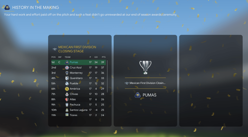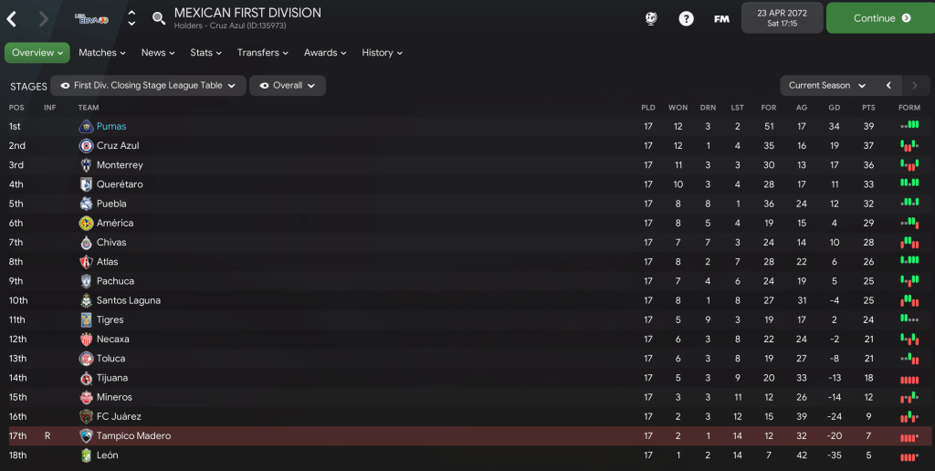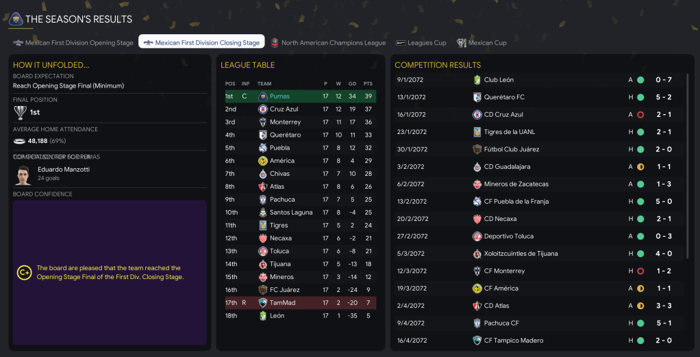Pumas won their final home game 2-0 against Tampico Madero, sending them into the final day leading Cruz Azul on goal difference. And a final day 4-2 win at Santos Laguna led by a Manzotti brace was enough for them to finish top of Liga MX Clausura – which, of course, is irrelevant. Pumas led the way with 29 points, two clear of Cruz Azul, and led the way with an impressive 51 goals in 17 matches!