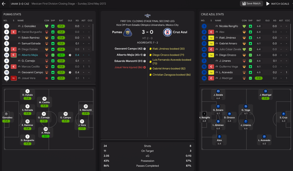 Pumas came out and dominated the first half of the second leg, racking up 14 shots to two before Campo made one count, curling home a lovely effort on 42 minutes. Mejía made things comfortable, making it 2-0 in first-half injury-time, before Manzotti smashed home his 45th goal of the campaign just after the break.