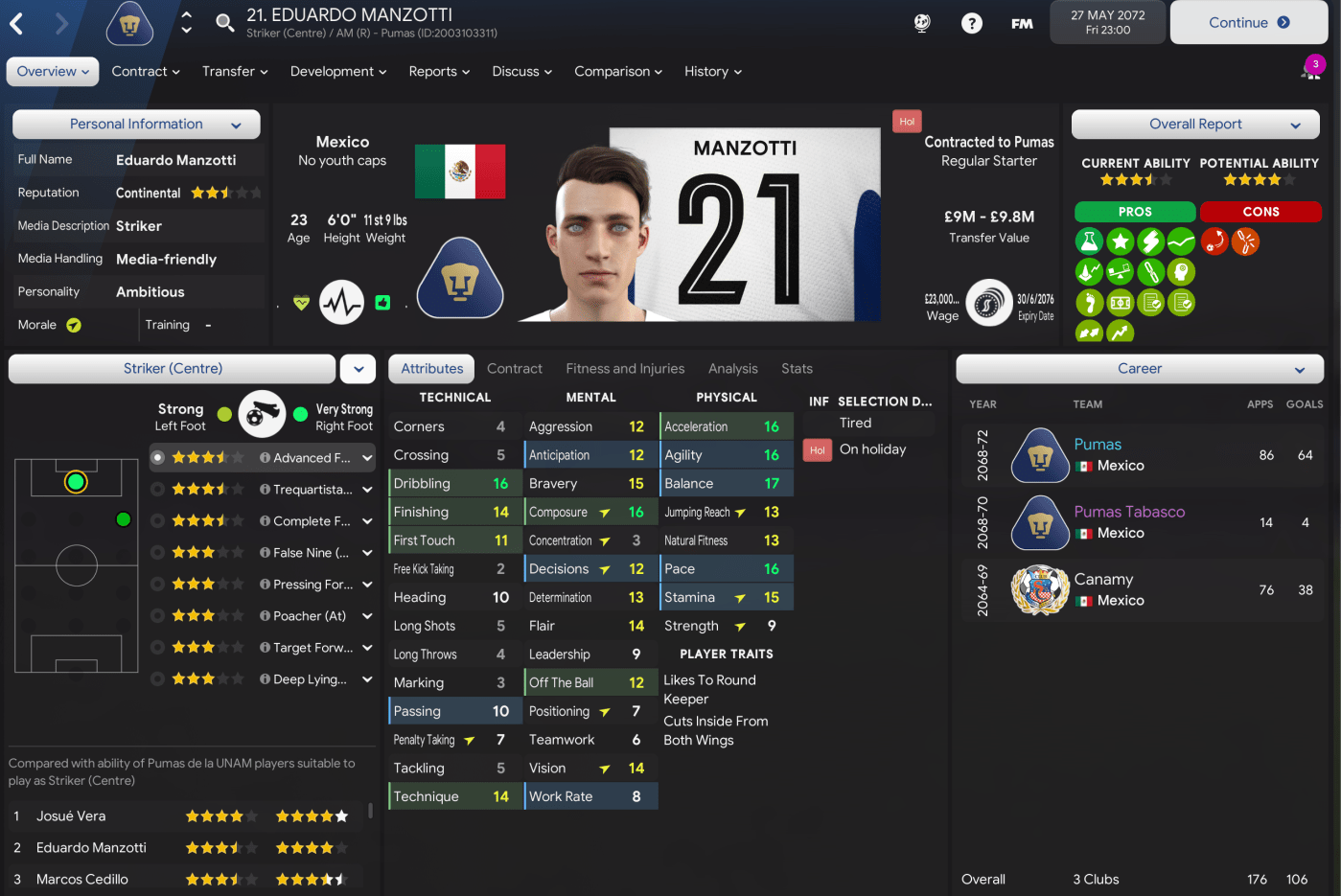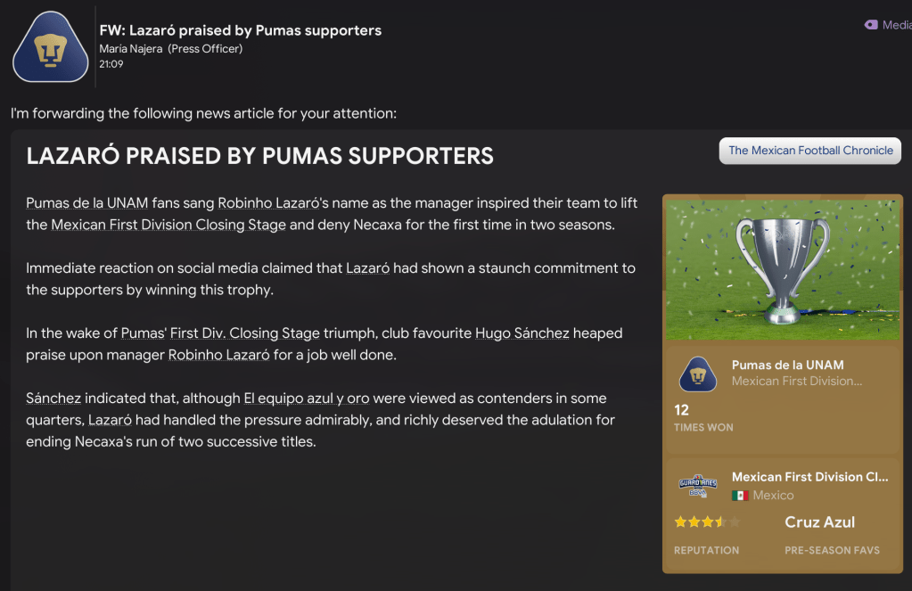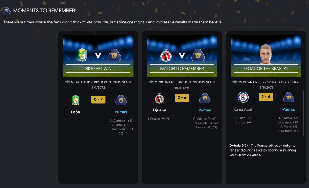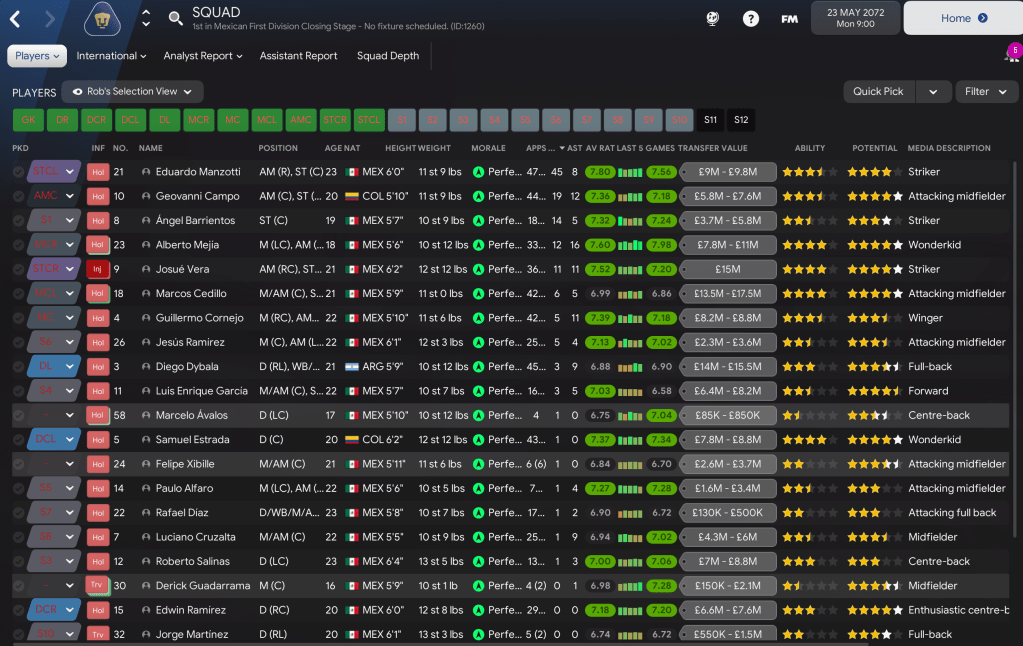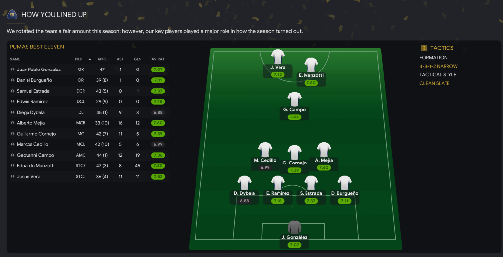 The key player this season has been Manzotti, who set two new club records with his 39 goals in 43 league games and 45 goals in 50 games in all competitions. He also averaged a 7.80 across the season, winning Mexican Attacker of the Season and the fans’ player and young player of the season.