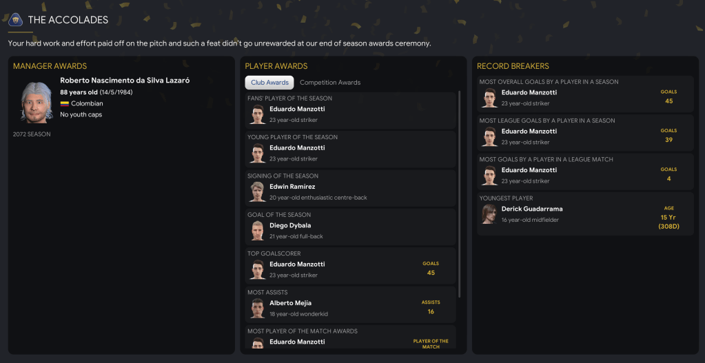 Mejía pushed him close with a club-high 16 assists and 12 goals. He followed up his NxGn 2071 win by coming second in NxGn 2072, only losing out to an incredible Inter 18-year-old centre-back who already has six caps for Italy. Another impressive performer was Campo, who scored 19 goals and got 11 assists in 45 appearances, while Barrientos scored 14 in 28 appearances, of which just 18 were starts.
