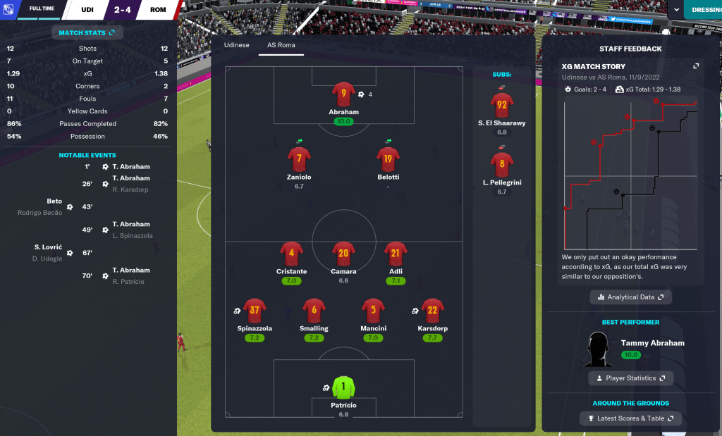 And yet another away match (that’s four out of five!) took us to Udinese, but this time we not only had a shot but scored inside 29 seconds! Some shocking defending gifted Abraham the opener then great play by impressive right-back Rick Karsdorp put a second on a plate for the striker. Udinese were allowed back into it as Patrício let their first shot on target in, but that man Abraham doubled the lead with a sublime left-footed volley. More shaky defending gifted Udinese a second before Abraham latched onto a Patrício hoof to slam a right-footed volley into the net. Another four-goal haul takes Abraham to 12 goals in five league games – which is only five fewer than he scored all of last season (17 in 37)!