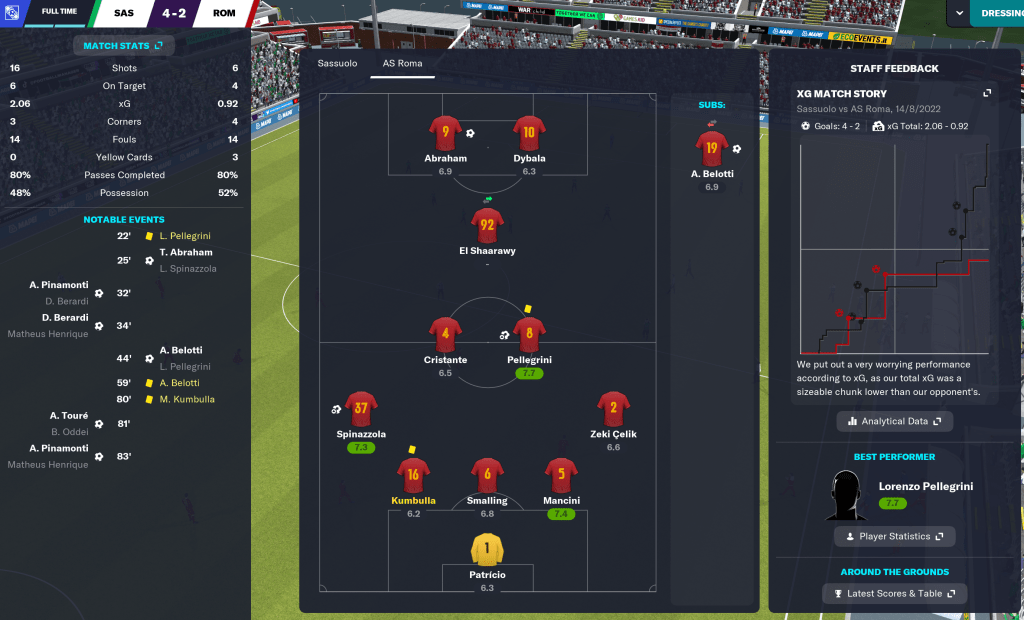 Yet another injury saw Dybala ruled out for four weeks and without him I moved Pellegrini forwards with Faticanti making his full debut. And we started poorly next up at Bologna, conceding after 25 minutes. But that man Abraham turned the game around, scoring twice in 18 minutes from brilliant Spinazzola and Pellegrini assists to nick a 2-1 win. That takes Abraham to eight goals in three games, which obviously won him the first Player of the Month of the season.