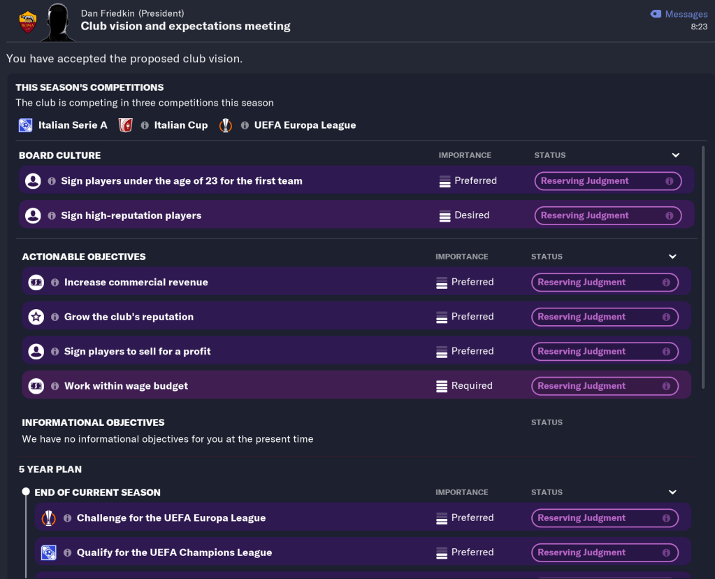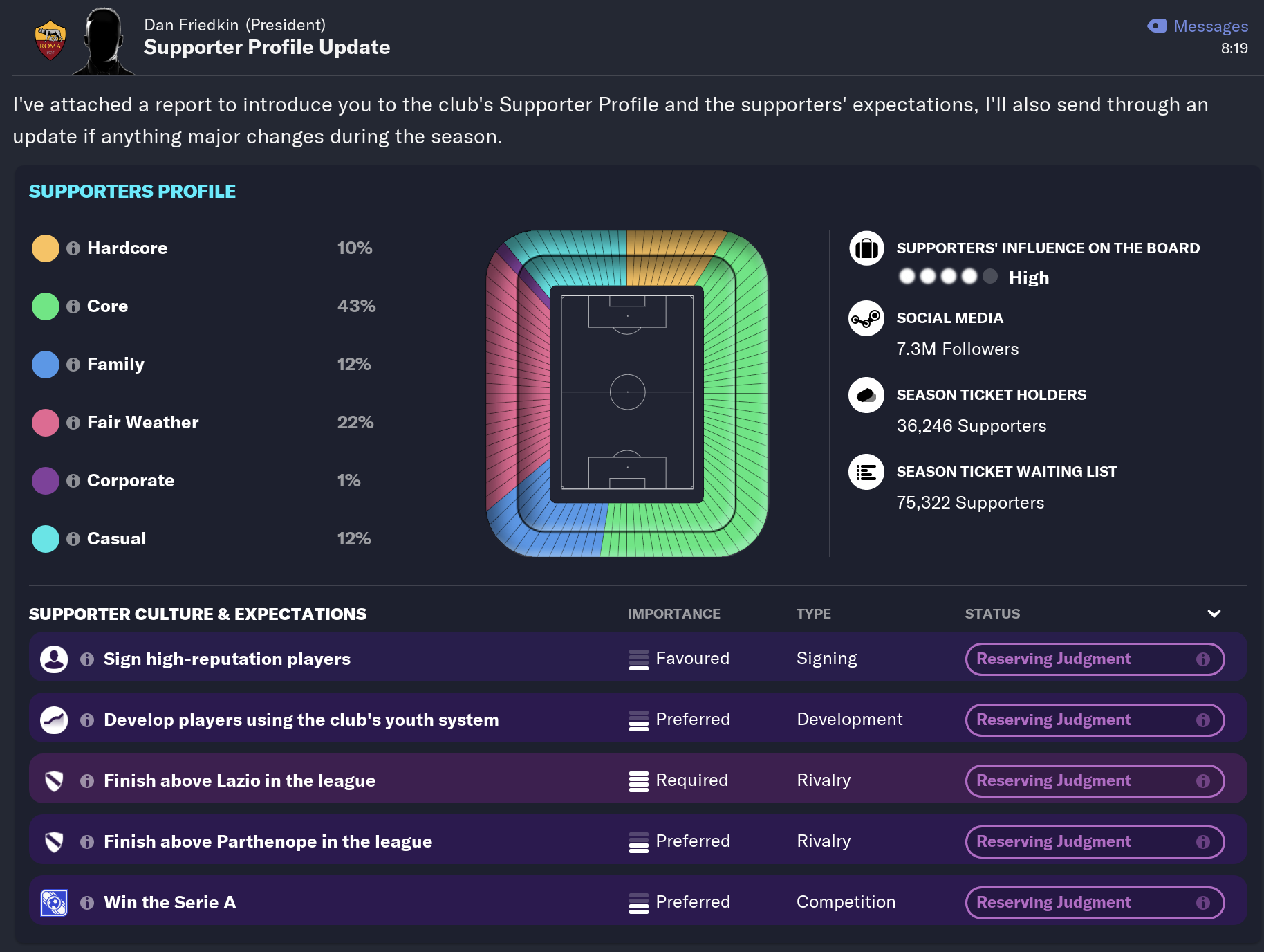 The board expects us to sign young and high-reputation players and sell players for a profit, grow the club’s revenue and reputation and, somewhat ambitiously, qualify for the Champions League. While the fans – which is a feature I really like the look of – also want to see young and high-reputation players signed, finish above Lazio and Napoli (aka Parthenope) and, very ambitiously, want us to win Serie A!