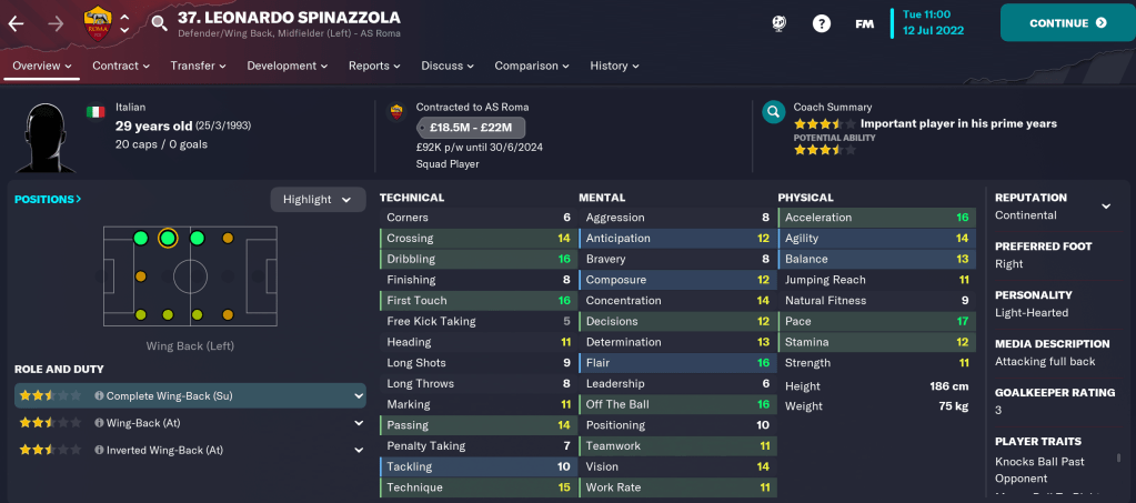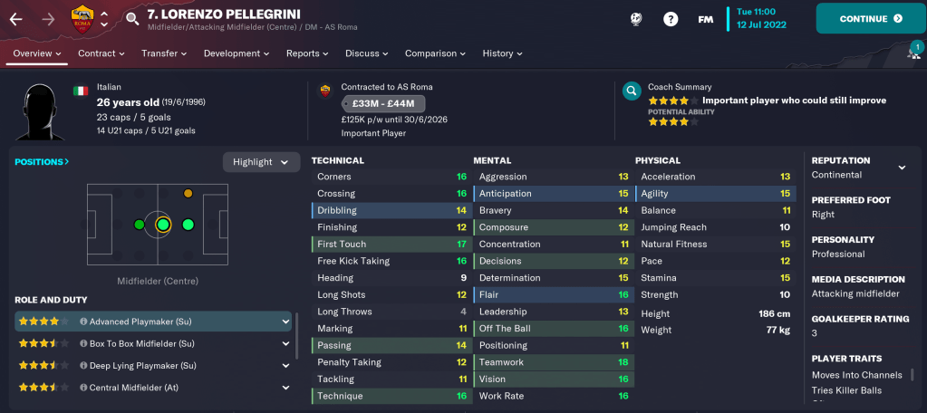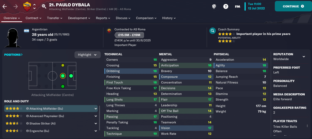 The best player at AS Roma is midfielder Lorenzo Pellegrini, followed by attacking midfielders Paulo Dybala and Nicoló Zaniolo, who I’m really excited to work with, and goalkeeper Rui Patrício. We also have two attacking full-backs in left-sided Leandro Spinazzola and right-sided Zeki Celik and two fellow English chaps in centre-back Chris Smalling and striker Tammy Abraham.