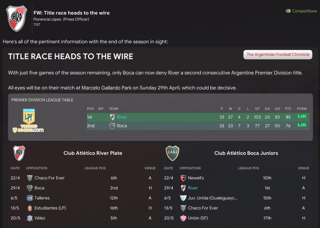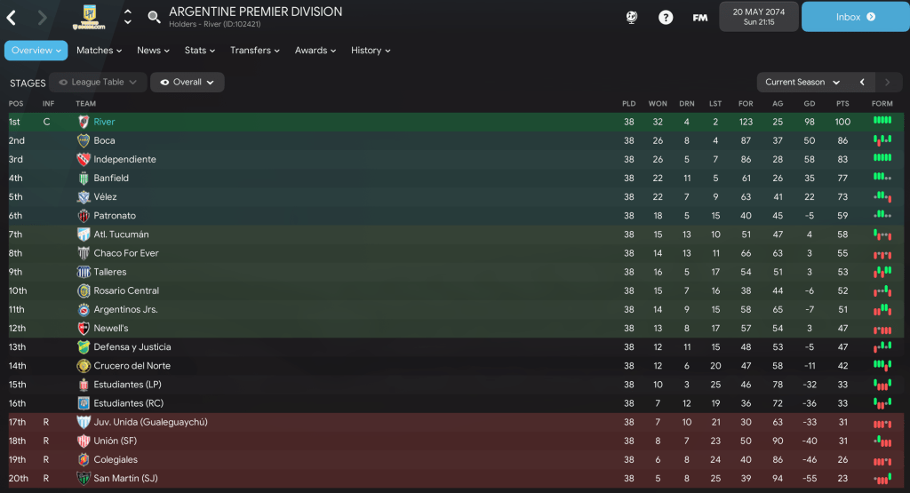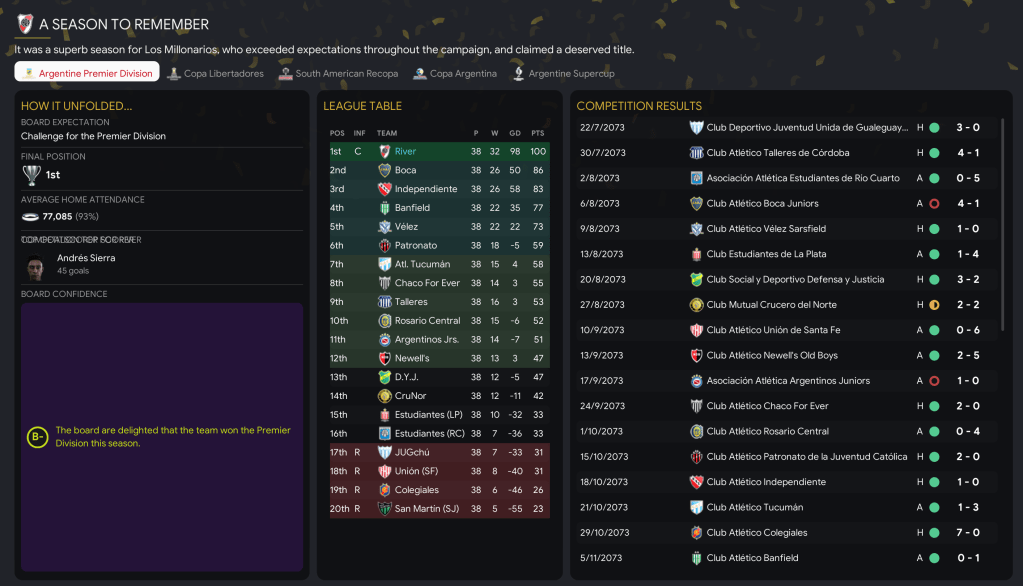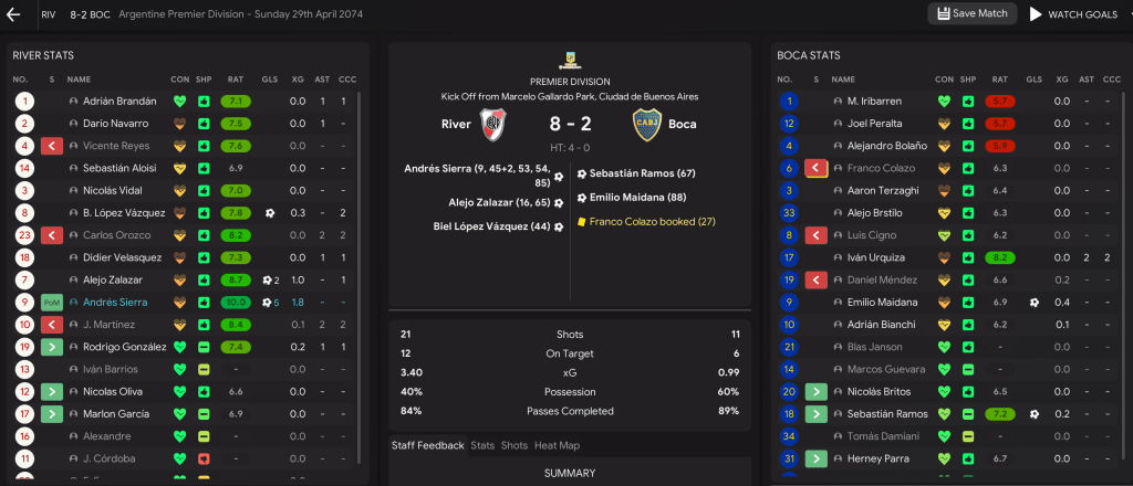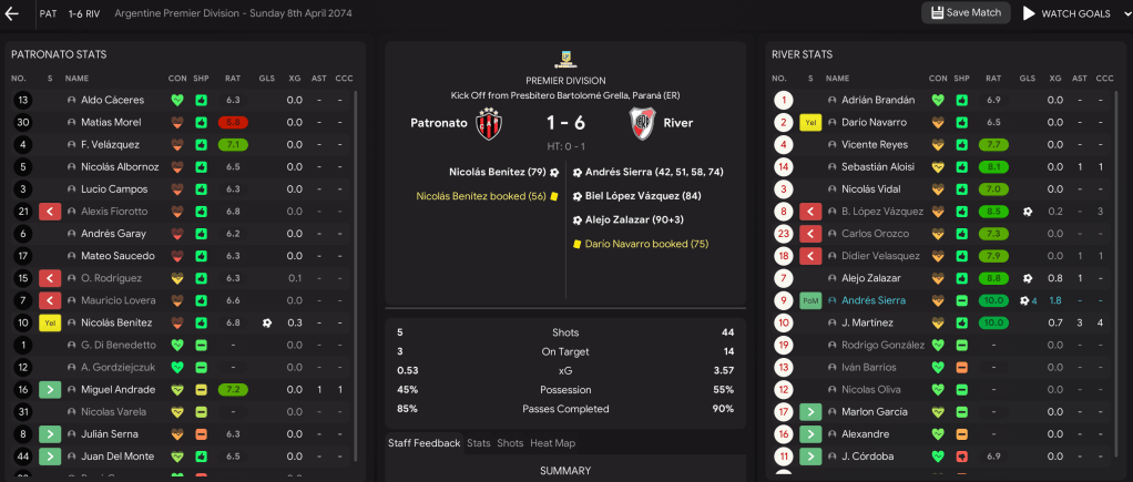Game 5 – Argentinos Jrs. (11th, home): Lazaró cracked the outrageous milestone of 2,500 matches as a Football Manager as he led out River against Argentinos Jrs. Boca played first and won 2-1 at third-place Independiente to close the gap to six points and pile a bit of pressure on. And River looked to be feeling it until that man Zalazar settled any nerves with a 65th-minute opener before a late Sierra strike.