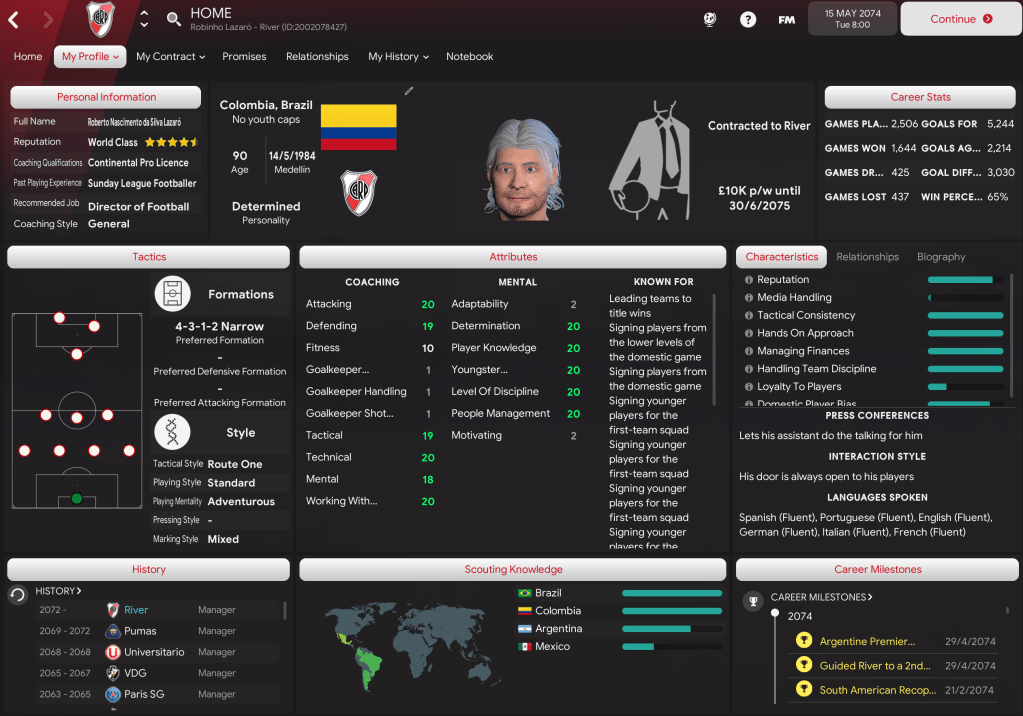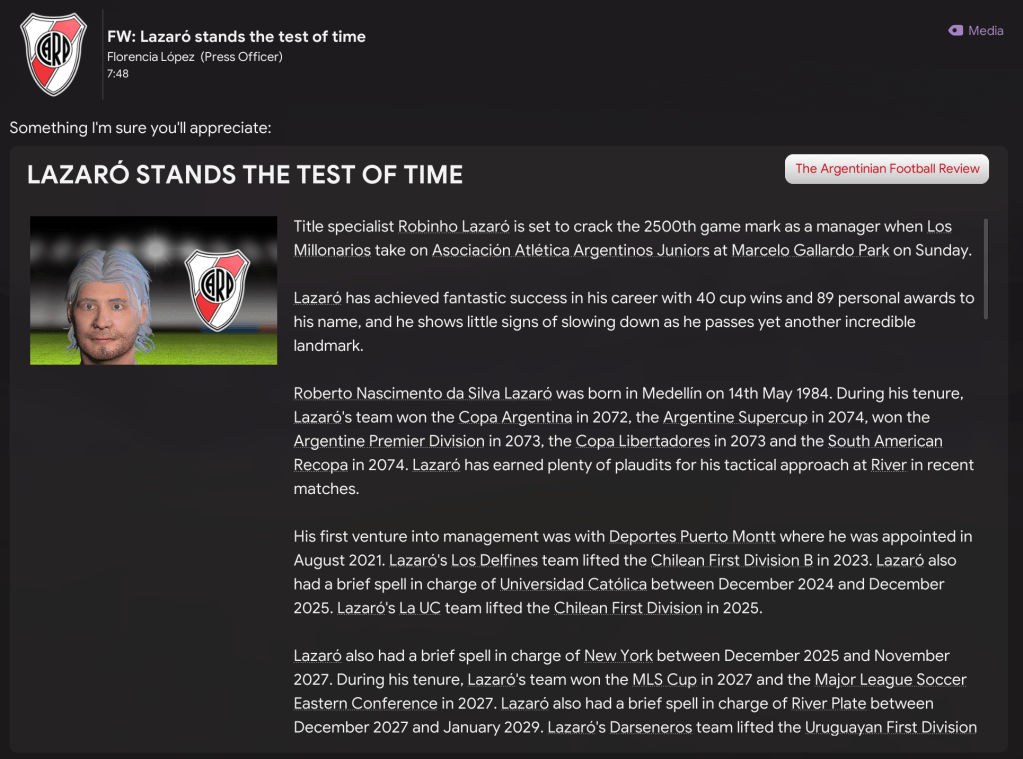 The Colombian/Brazilian was oh-so-close to becoming the greatest Football Manager of all time with his dominant young River Plate side taking Argentina by storm. Heading into 2074, Lazaró had just become Champion of South America for the third time and was eyeing up another Argentinian title.