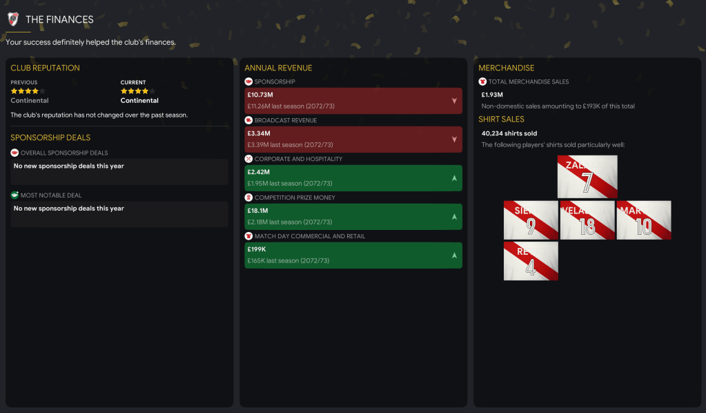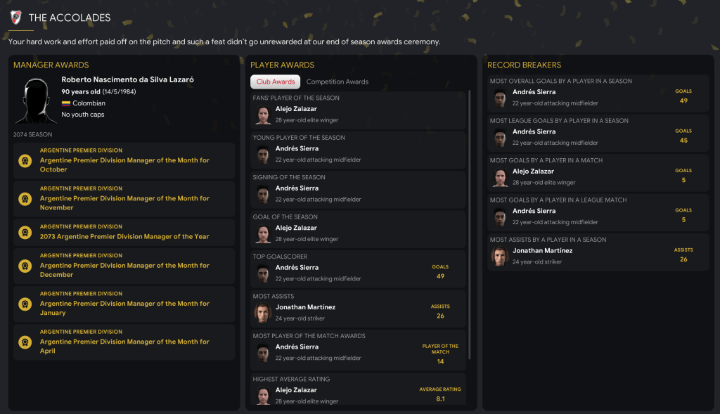 The end of 2073 saw Alejo Zalazar defend his South American Footballer of the Year award, while the prolific Sierra, who’s scored 23 in 20 in the league, won World U21 Footballer of the Year and Young Argentine Player of the Year.
