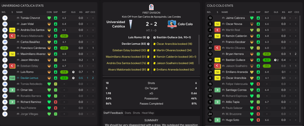 His second home game saw Colo-Colo come to town in the Albo-Cruzado Derby. Católica made a great start as Romo scored early but Colo levelled things up. Lazaró thought his side had nicked it late as Lemus got his first goal under the new boss only for Colo to undeservedly equalise in injury-time. And Lazaró fined 34-year-old goalkeeper Tomás Chevrot, who he really wanted to sell, two weeks’ wages.