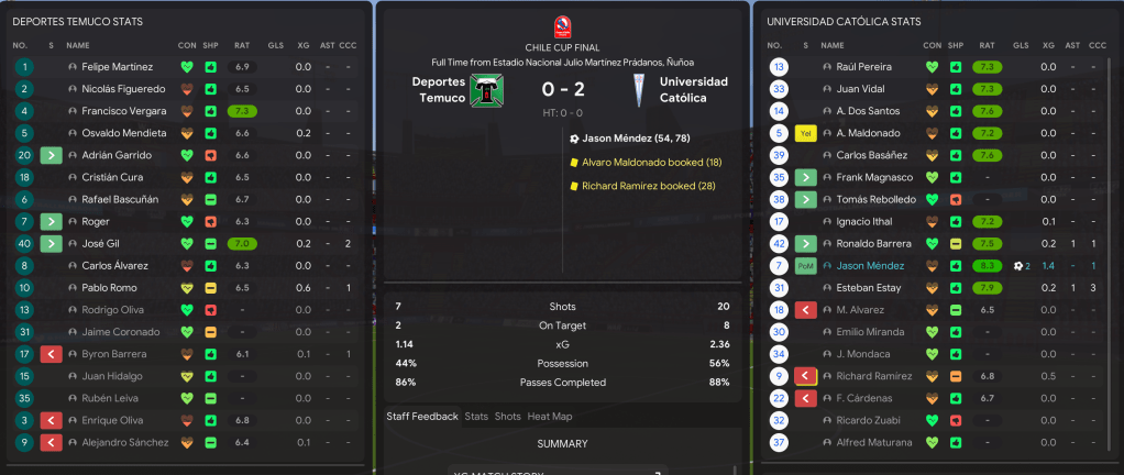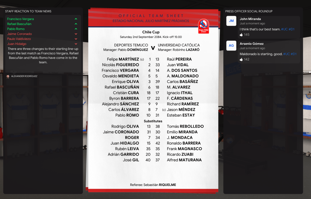 That Final arrived three days later as 10-time winners Católica faced off against Temuco, who’ve never won the cup but were runners-up in 2077 and 2080. The team was exhausted, three players were on international duty, two were ineligible and Lazaró had just 14 players available! So he lined up: