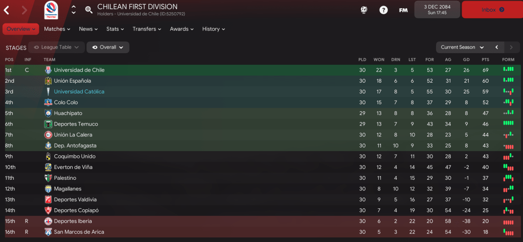 Católica are currently fifth halfway through the Chilean First Division (top tier) with 27 points from 15 games, eight points behind leaders and rivals Universidad de Chile. But they were expected to finish third and only trail third-place Coquimbo Unido by one point.