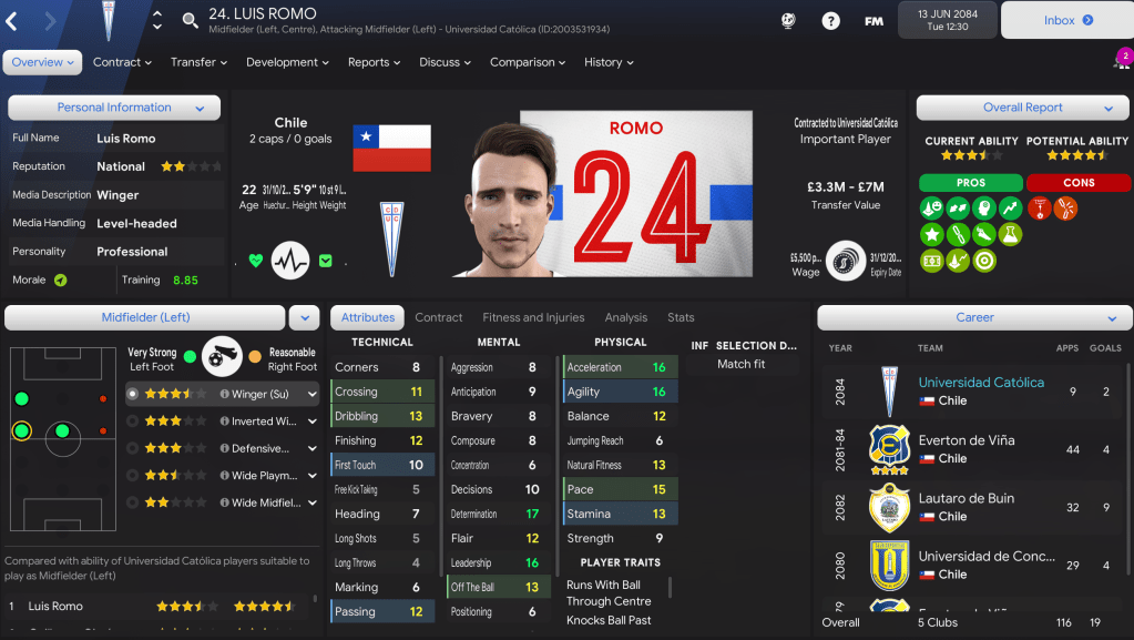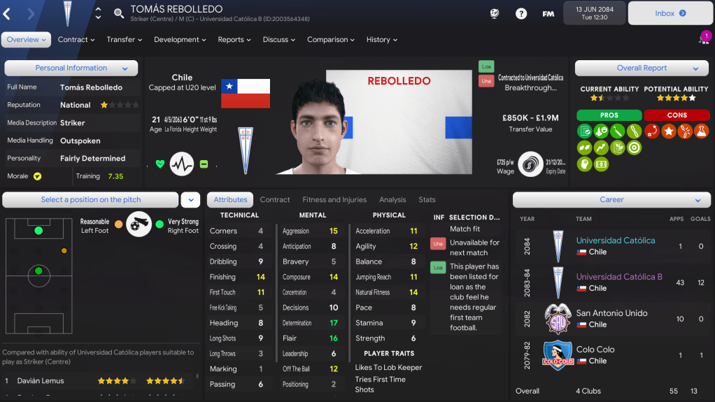 Luckily, there were a few solid prospects in the youth teams, led by 5-star potential striker Tomás Rebolledo – although his potential has probably been wasted given he’s now 21. There were also four 4.5-star potential players in 16-year-old winger Massami Gillier, 18-year-old winger Braulio Varas and two 20-year-olds in striker Ricardo Zuabi and defender Juan Vidal. There were also eight players with 4-star potential who Lazaró suspected may get thrust into the first team.