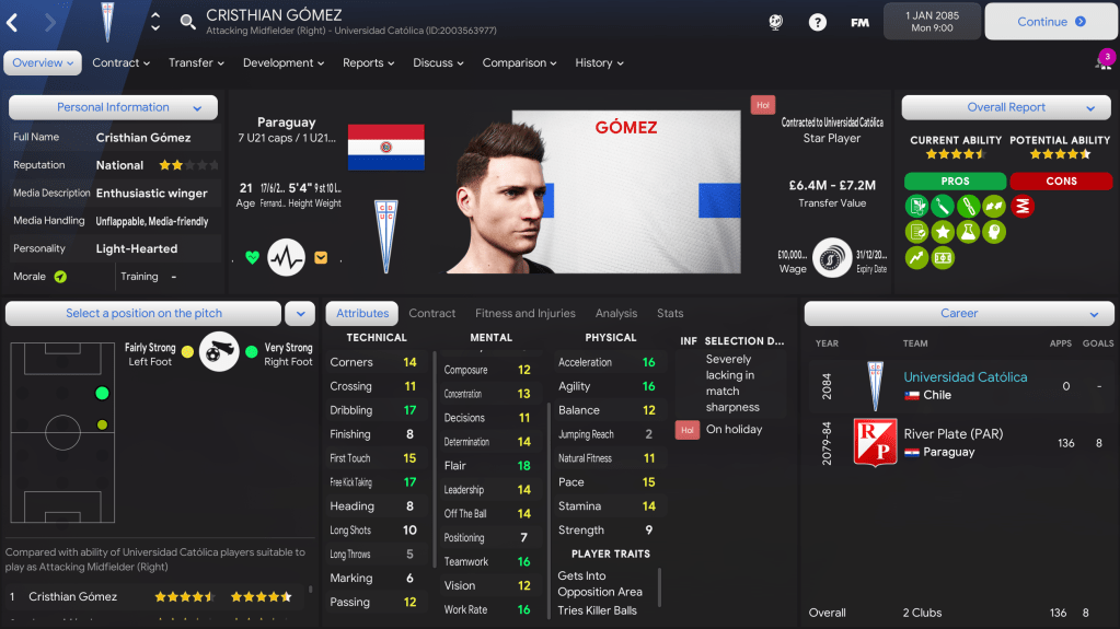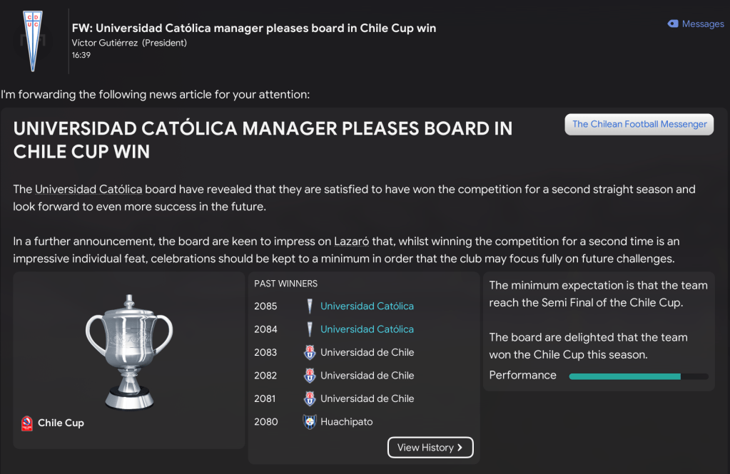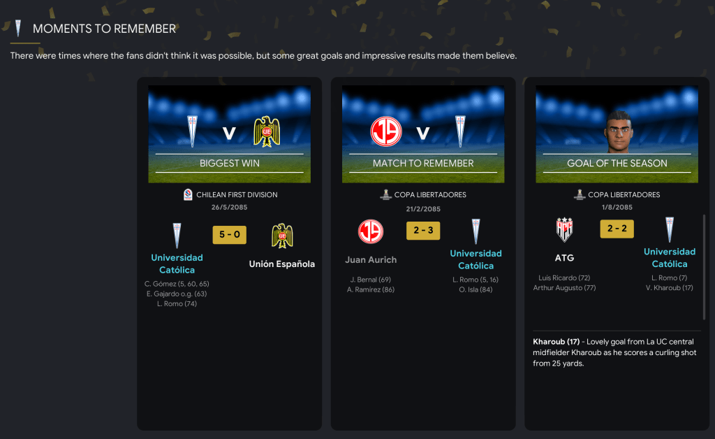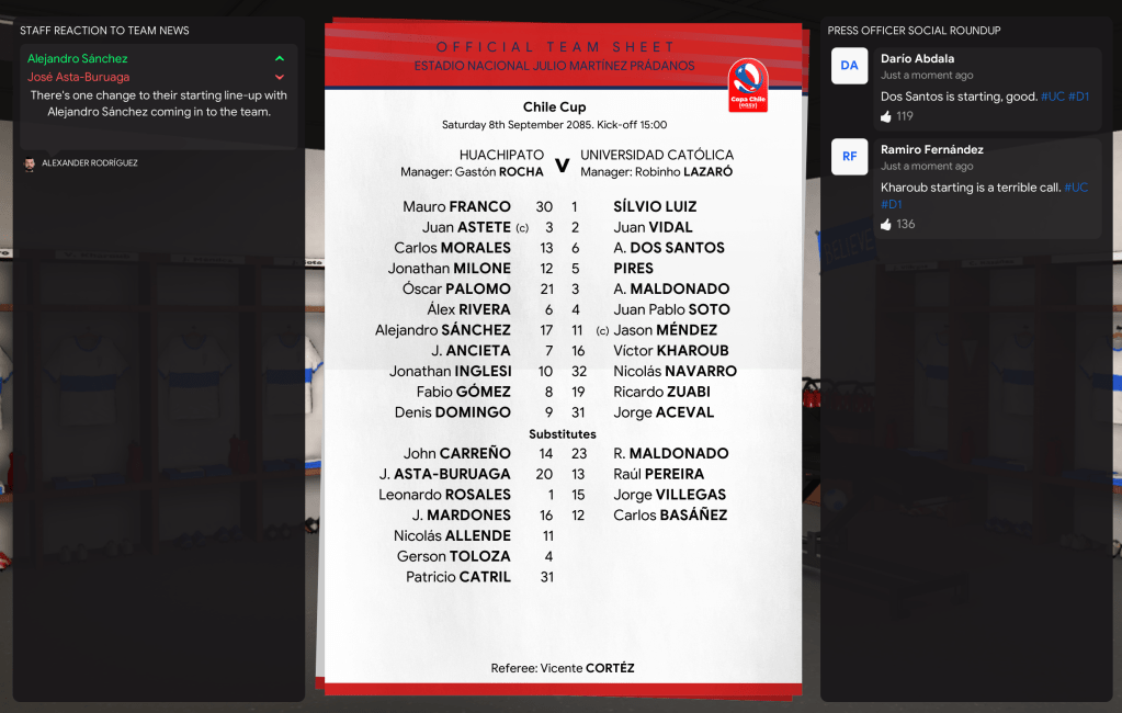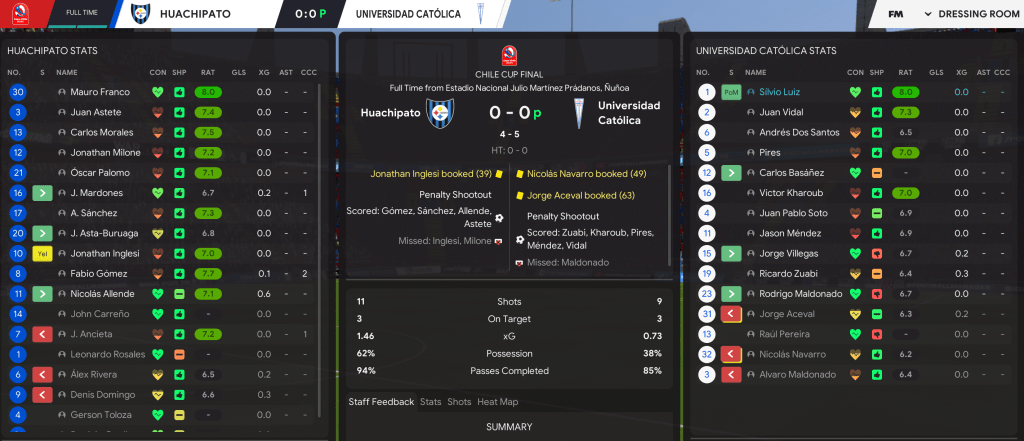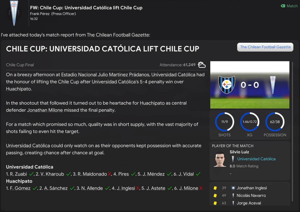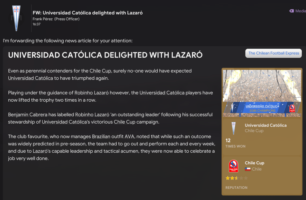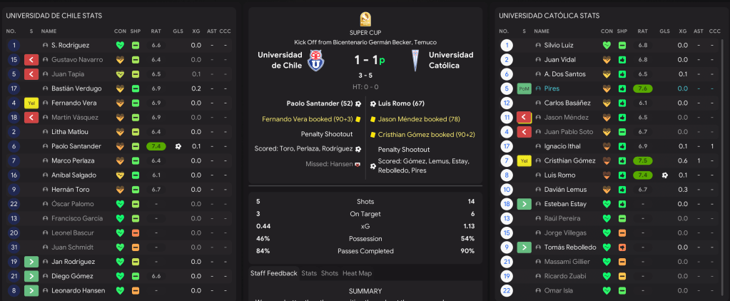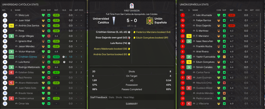 A better chance at silverware was Católica’s Chilean Cup defence. They got a tough start, beating Colo Colo 5-2 on aggregate in the third round then two 0-0 draws with UdC ended with Católica sneaking through on penalties. So they were now hot favourites to reclaim their crown. A 2-0 win away to nine-man Unión Espanola saw them with one foot in the Final but they had five of their starting front six away on international duty for the second leg, which Lazaró thought was absolutely ridiculous! However, his youngsters stepped up as striker Jorge Aceval, who Lazaró had never even heard of, bagged a debut brace and created the other for winger Braulio Varas to seal a 5-1 aggregate success.