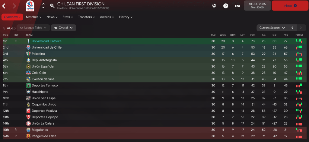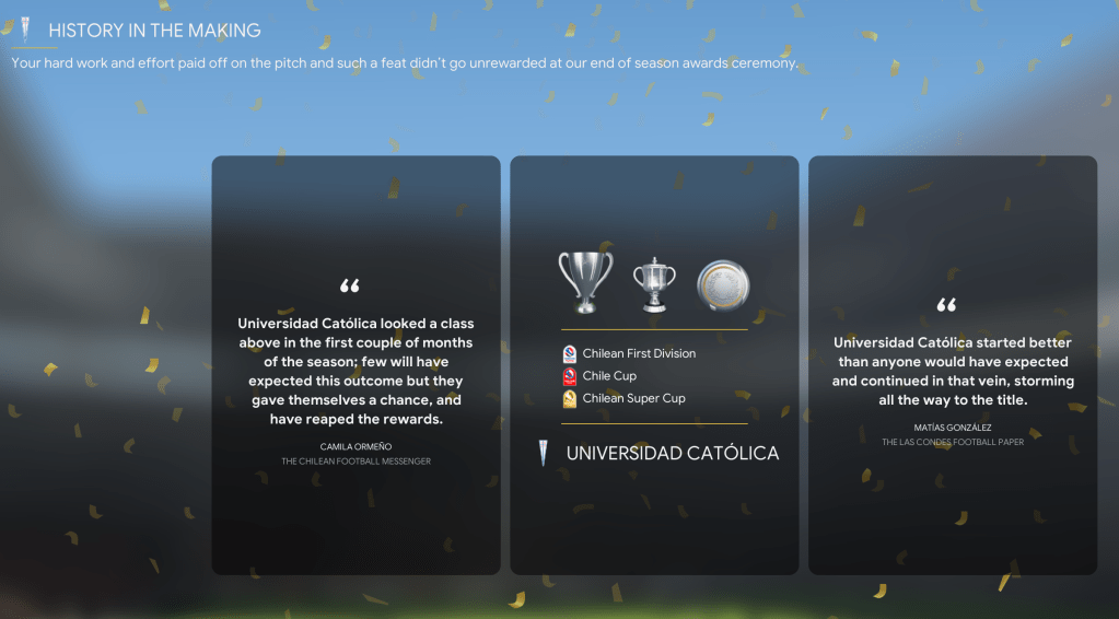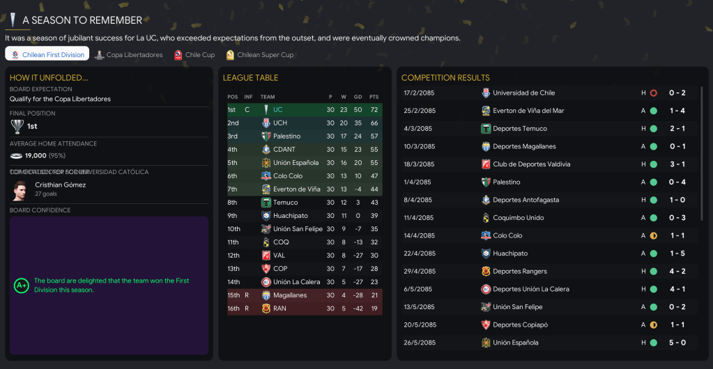 They rounded out the season by defeating Coquimbo Unido 3-2 then losing 1-0 at Unión Espanola. That saw them finish nine points clear with 72 points with 23 wins, three draws and four defeats, scoring a league-high 72 and conceding 23. And UdC’s 66 points was the highest-ever points tally without winning the league – but they sacked their manager anyway!