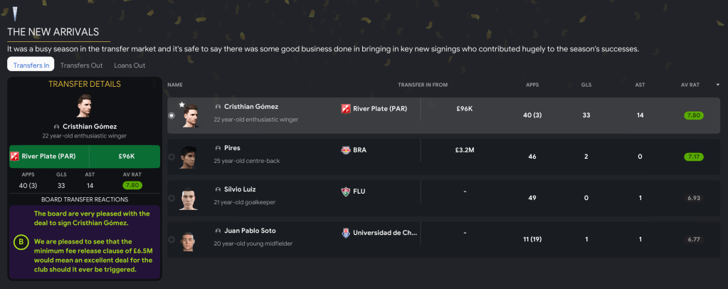 That gave Lazaró a transfer kitty of £13.5 million to work with. His first transfer back at the club was a bit of a doozy, bringing in winger Cristhian Gómez for £96,000 from Paraguay’s River Plate, and he’s already worth over £6 million – but a slight concern was a locked-in minimum fee release clause of £6.5 million. He was joined by two Brazilians in promising goalkeeper Sílvio Luiz, who joined for free from Fluminense, and centre-back Pires, who arrived for £2.5 million from Bragantino.