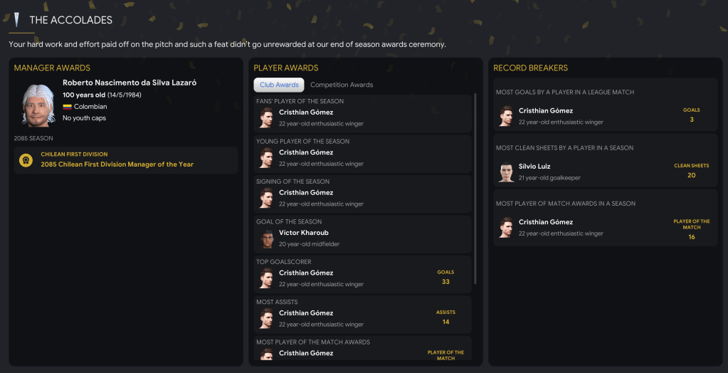 Lazaró celebrated his 101st birthday in May 2085 but, apparently, Football Manager can’t count past 100! He thought he’d wrapped up his career in style, winning the Chilean title to cap another treble. That leaves the Colombian/Brazilian with a career total of 46 cup victories and 42 national titles. What a legend!
