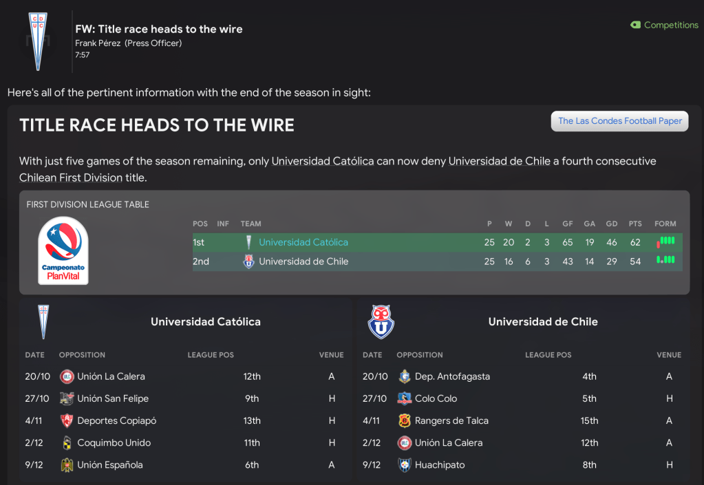 Católica continued in good form but so did UdC. And a 2-1 defeat at home to third-place Palestino, with Romo and Gómez both injured and then receiving two red cards, saw UdC close the gap to six points with nine games remaining. Two games later, the duo of Gómez and Romo were on the scoresheet in a 2-1 victory over local rivals Colo Colo, while UdC dropped points to move Católica eight clear. Gómez starred again with a goal and assist in both a 3-1 win over Huachipato and 4-0 win at Rangers de Talca.