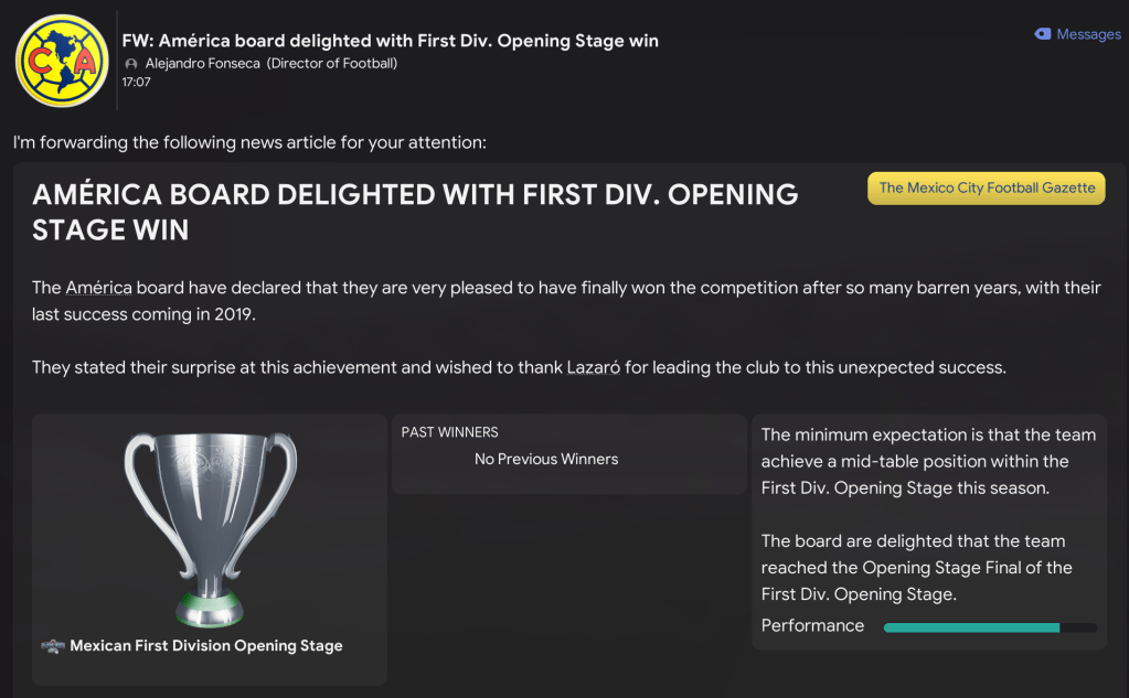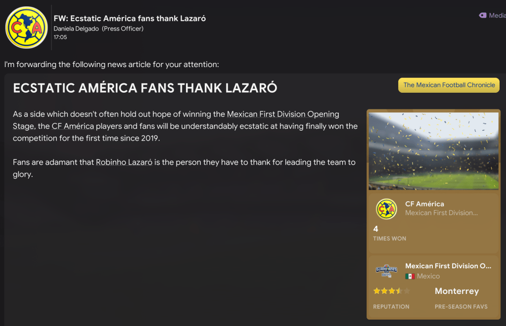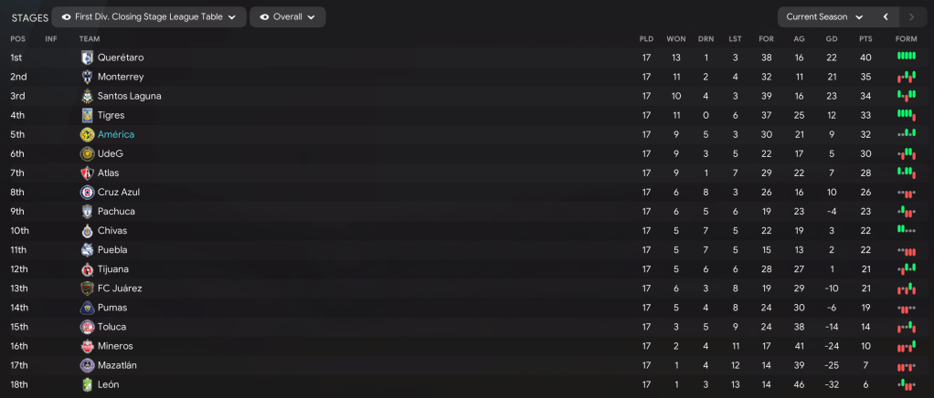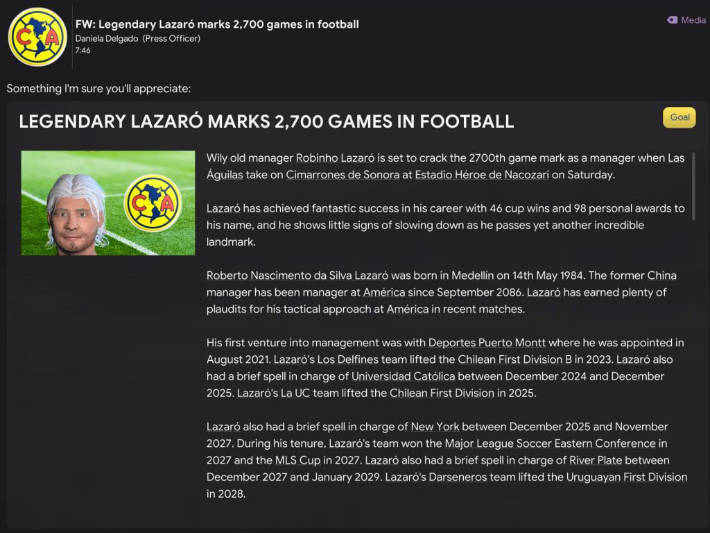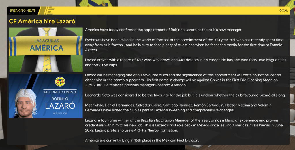 Club América plays home games at the impressive Azteca Stadium. Lazaró’s new side is traditionally one of the biggest in Mexico and has a real-life record 13 Liga MX titles. However, they haven’t won an Apertura or Clausura title in over 40 years, since their closing stage success in 2042. The club is currently 16th with just five points and seven goals from 10 games in Apertura, while both teams below them have games in hand.