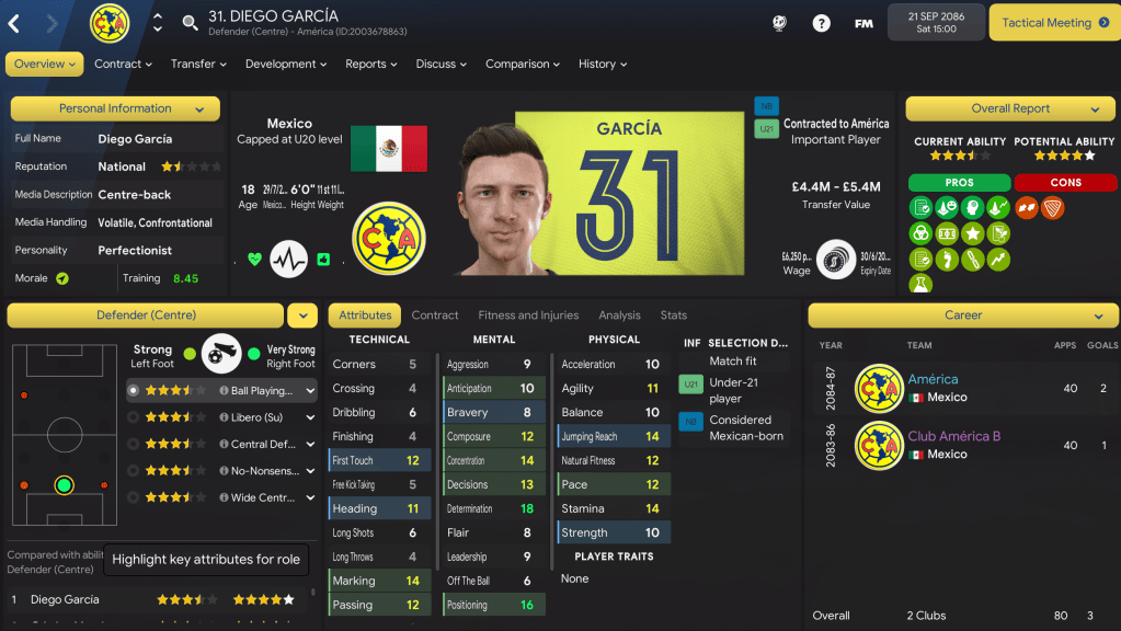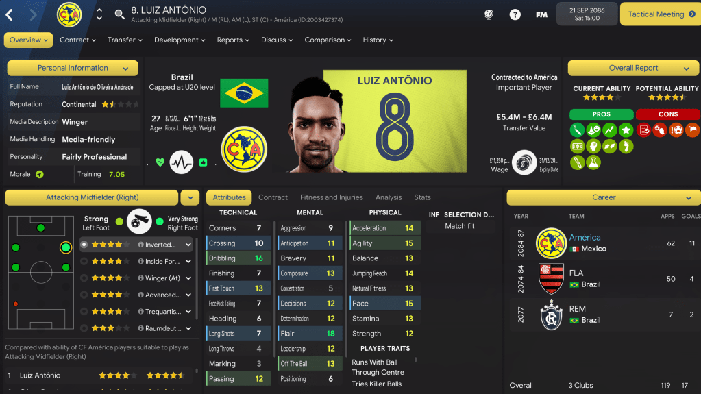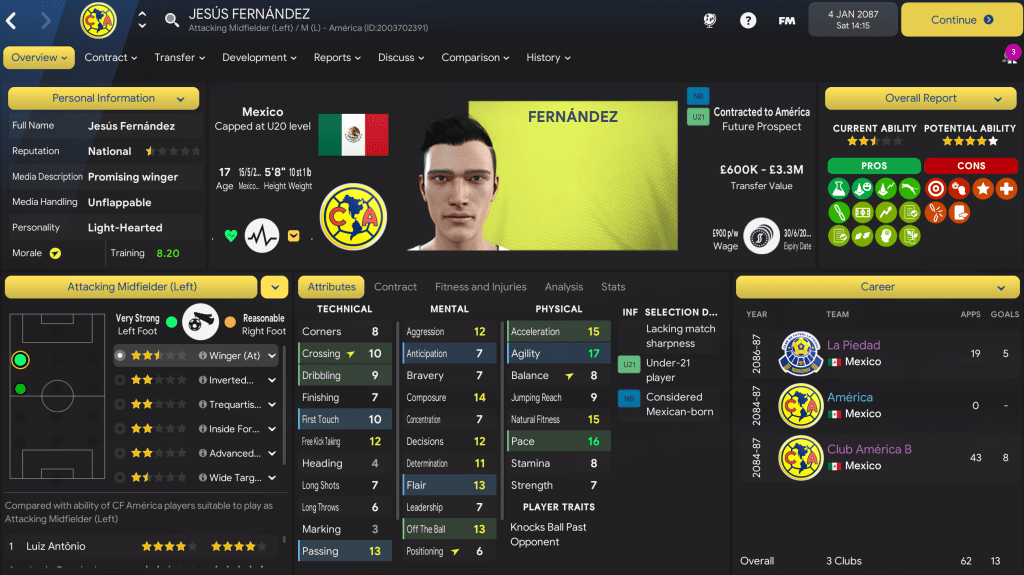 It was easy to see why América were struggling – their team was ancient, with seven players aged 34 or older. But their best player was winger Luiz Antônio and there were two exciting teenagers to build around in centre-backs Diego García and Luis Martínez. Plus there were seven players with 5-star potential in the youth teams, including midfielder Mario Alberto Téllez who Lazaró immediately promoted.